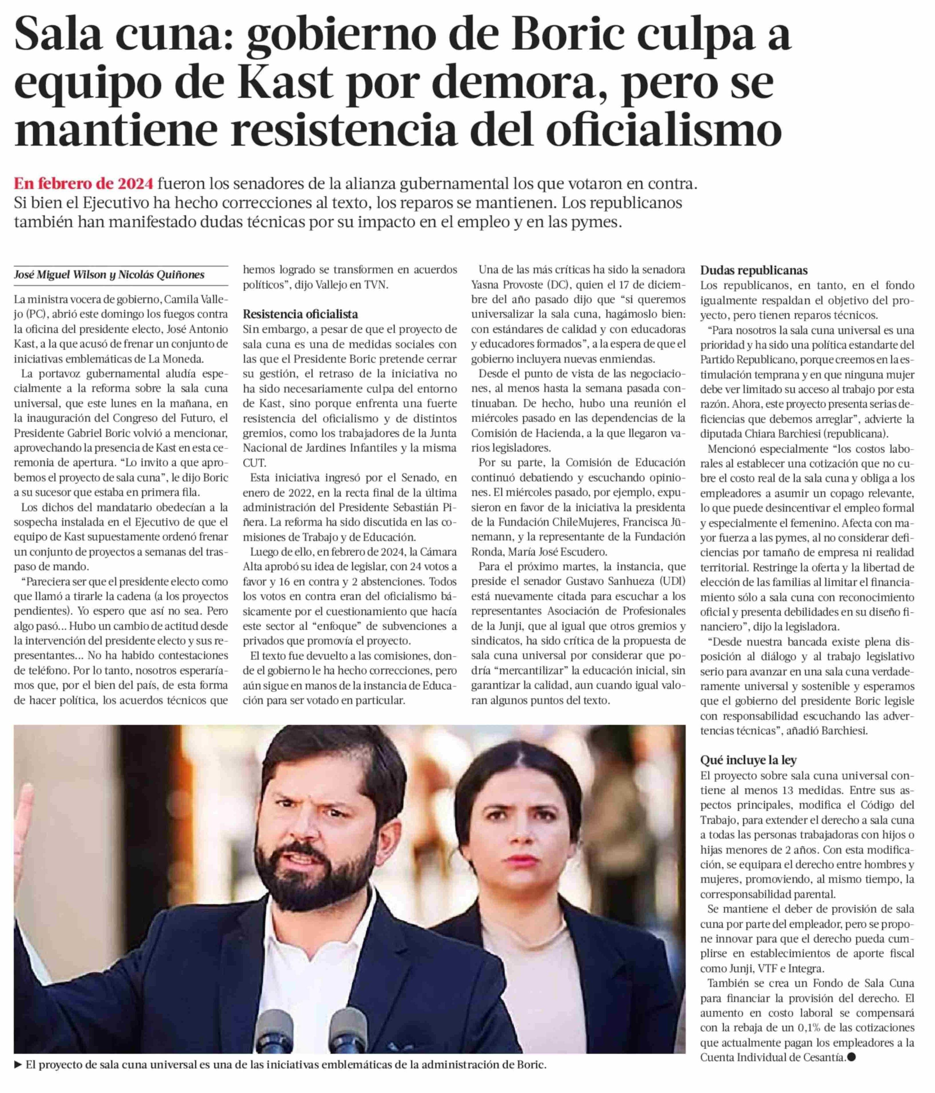 Sala cuna: gobierno de Boric culpa a equipo de Kast por demora, pero se mantiene resistencia del oficialismo 13-01-2026 La Tercera |
