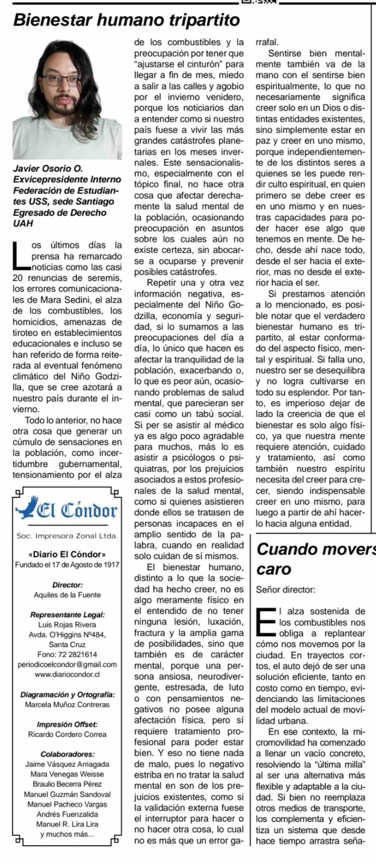 Columnas de Opinión: Bienestar humano tripartito 25-04-2026 Diario El Cóndor |