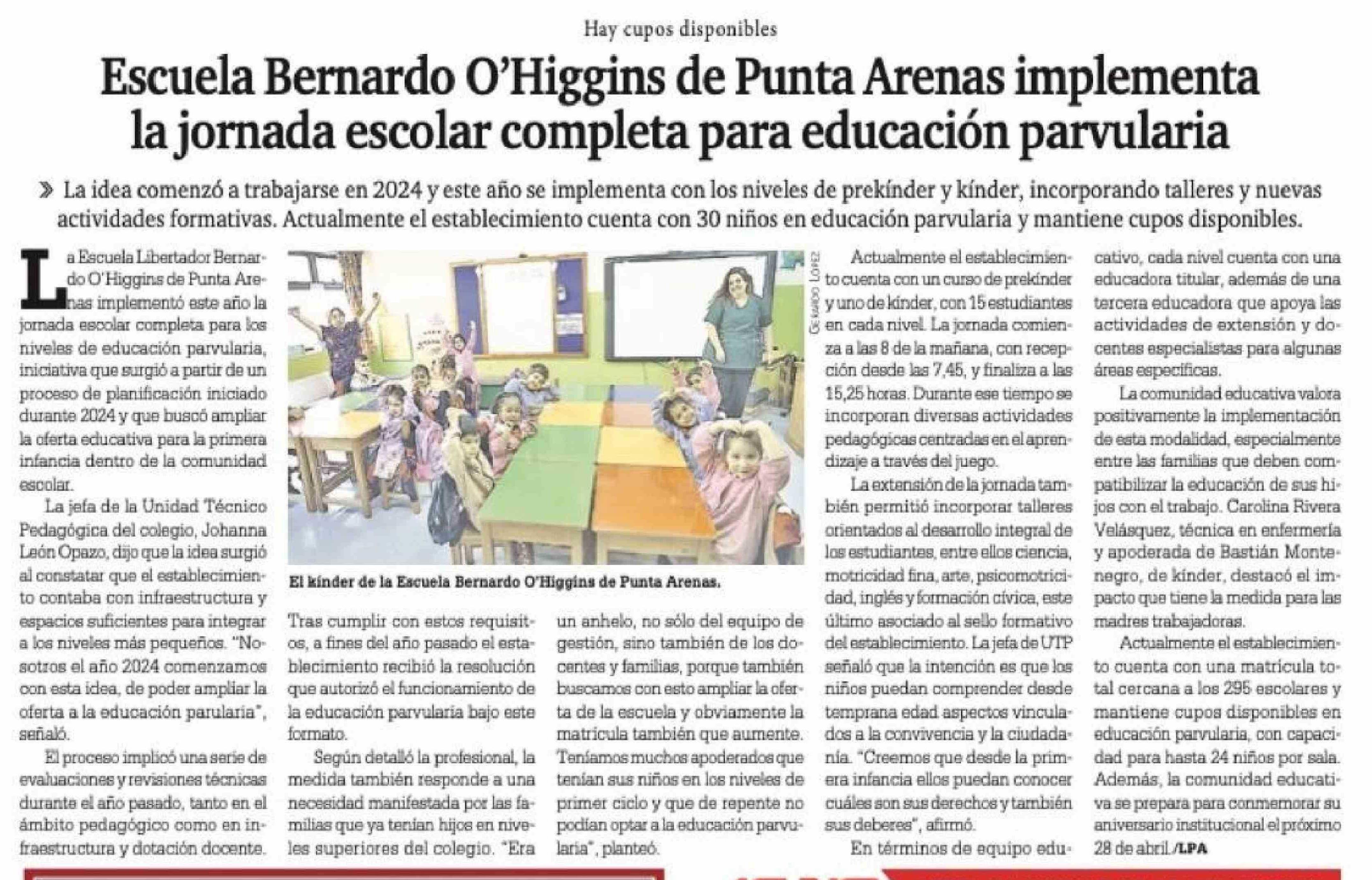 Escuela Bernardo O'Higgins de Punta Arenas implementa la jornada escolar completa para educación parvularia 13-03-2026 La Prensa Austral |