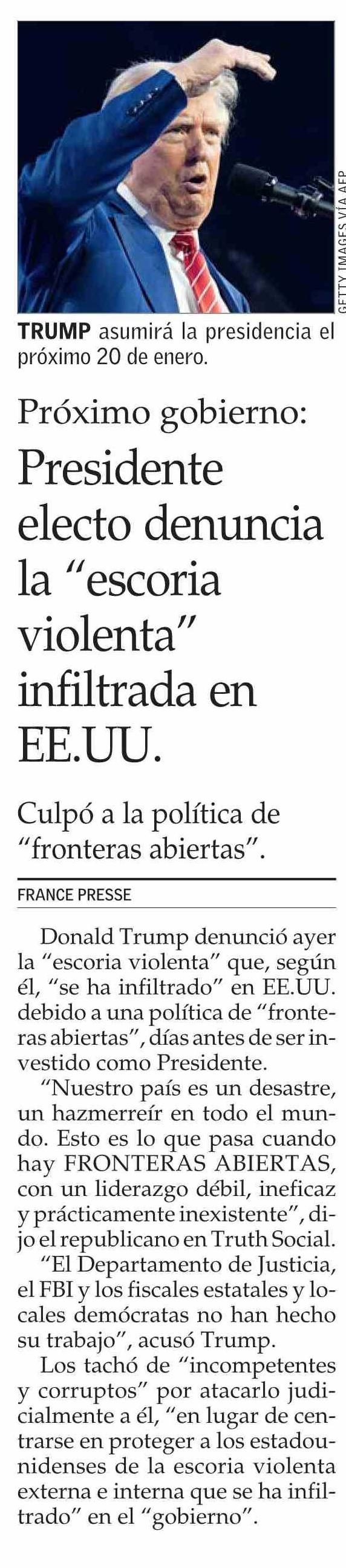 Presidente electo denuncia la "escoria violenta" infiltrada en EE.UU. 03-01-2025 El Mercurio |