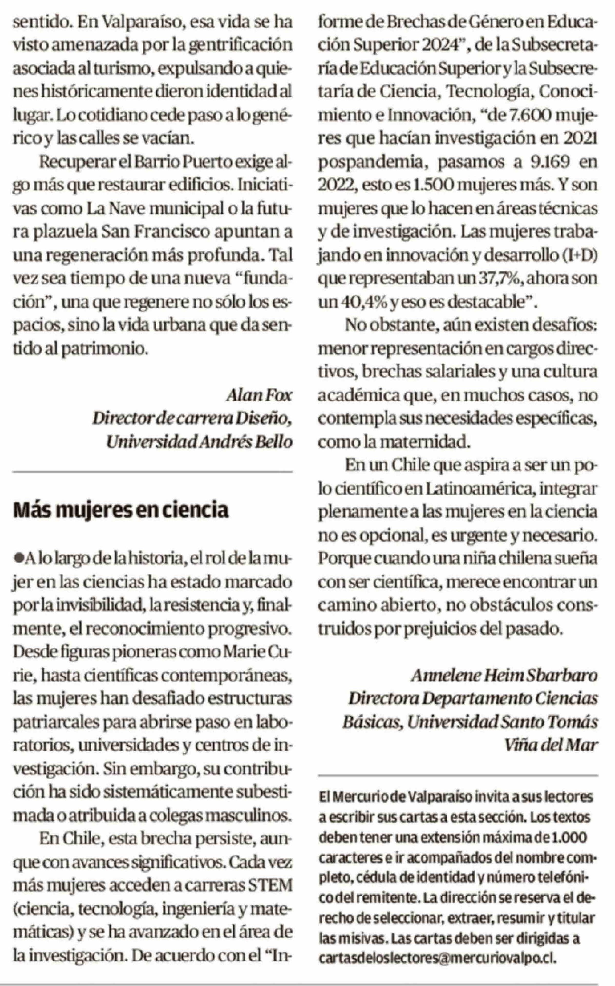 Cartas: Más mujeres en ciencia 11-02-2026 El Mercurio de Valparaíso |