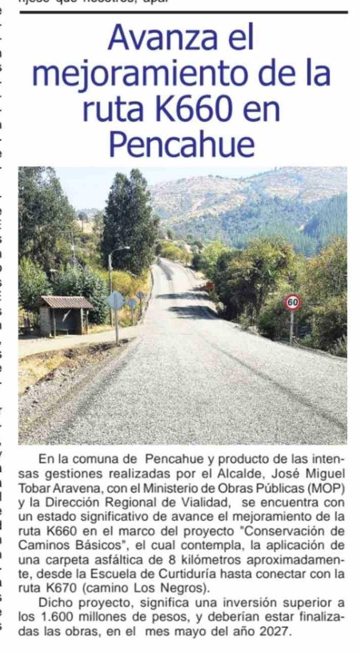 | Título: | Avanza el mejoramiento de la ruta K660 en Pencahue |