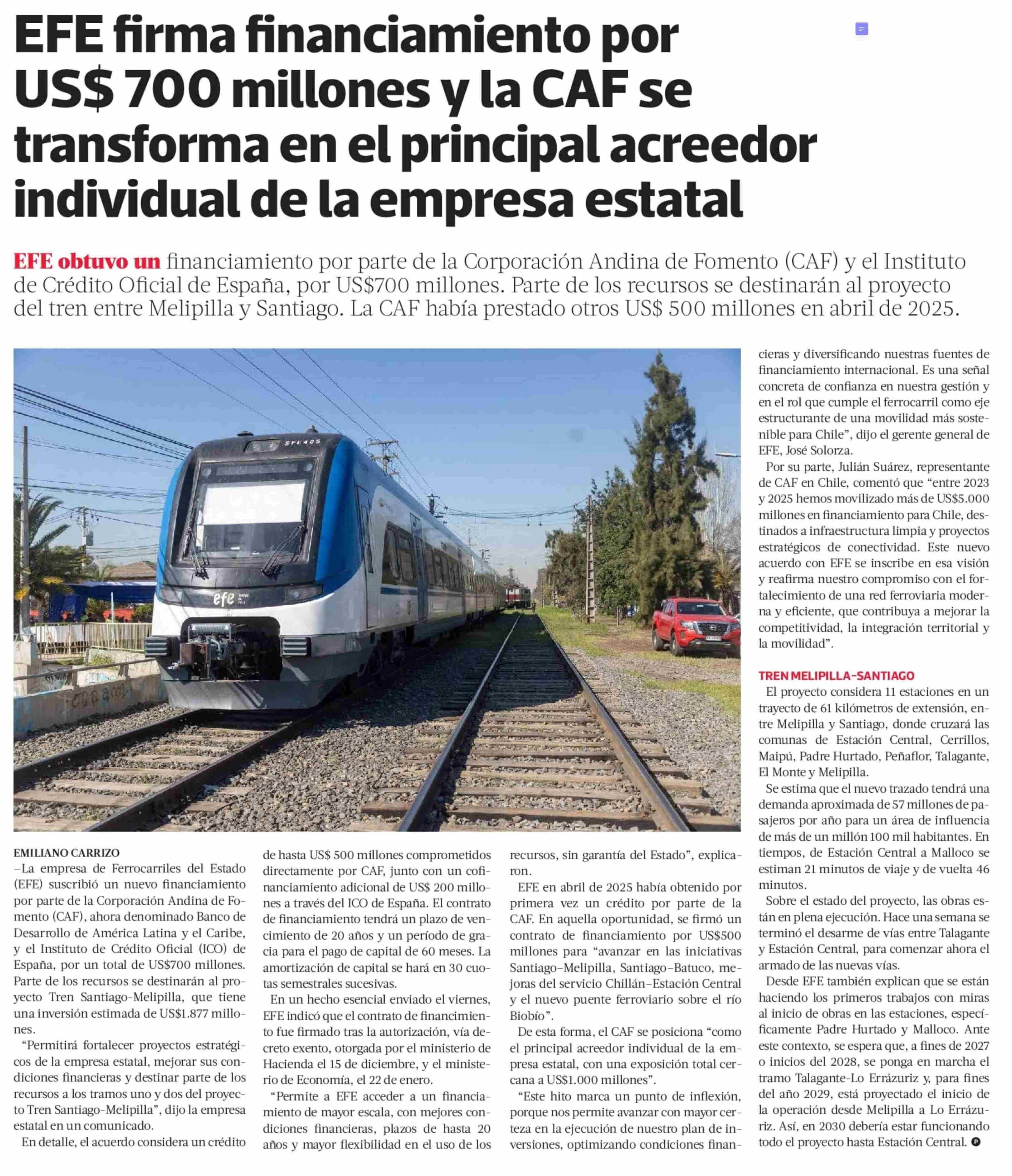 EFE firma financiamiento por US$ 700 millones y la CAF se transforma en el principal acreedor individual de la empresa estatal 27-01-2026 La Tercera |