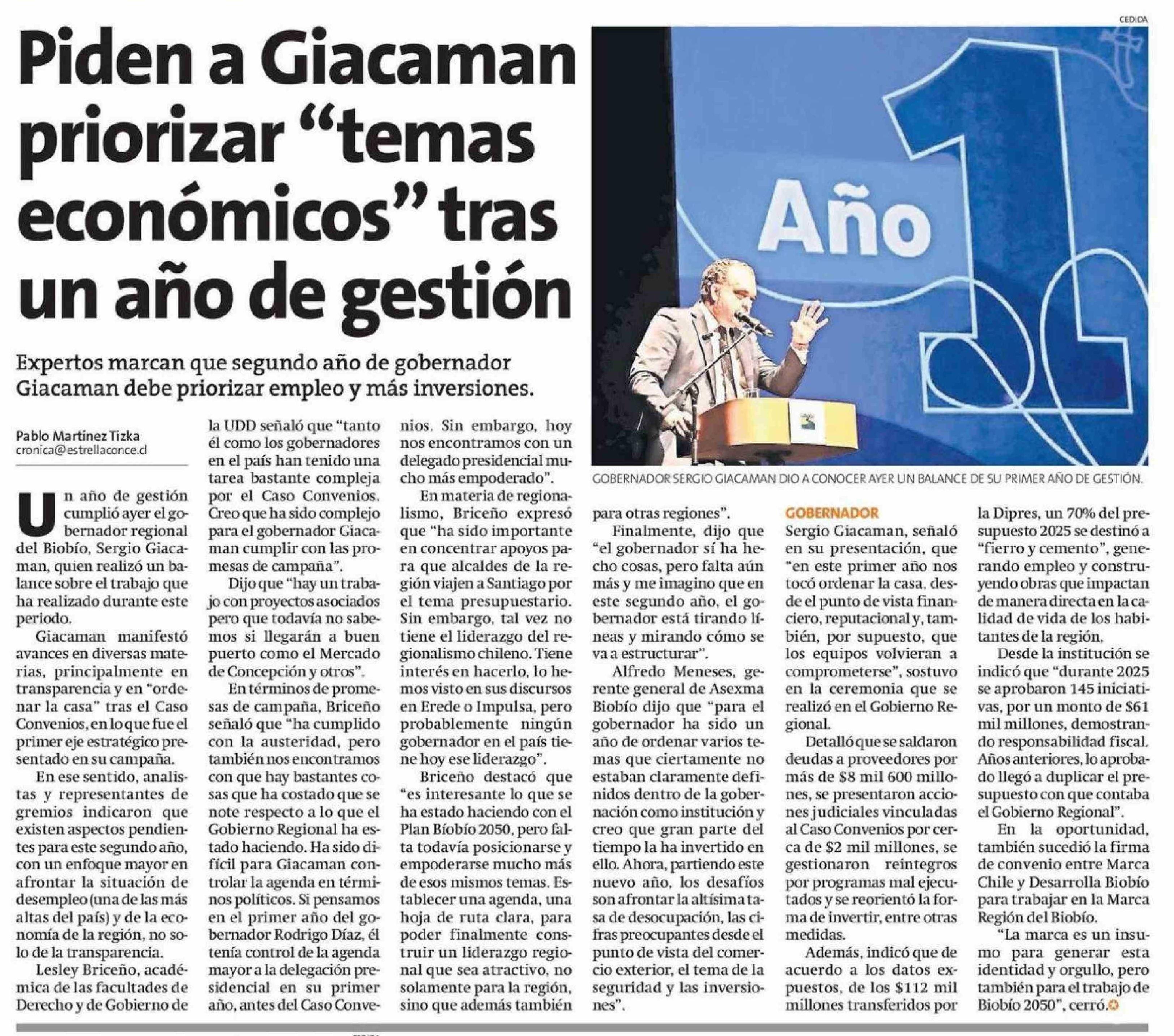 Título: Piden a Giacaman priorizar "temas económicos" tras un año de gestión