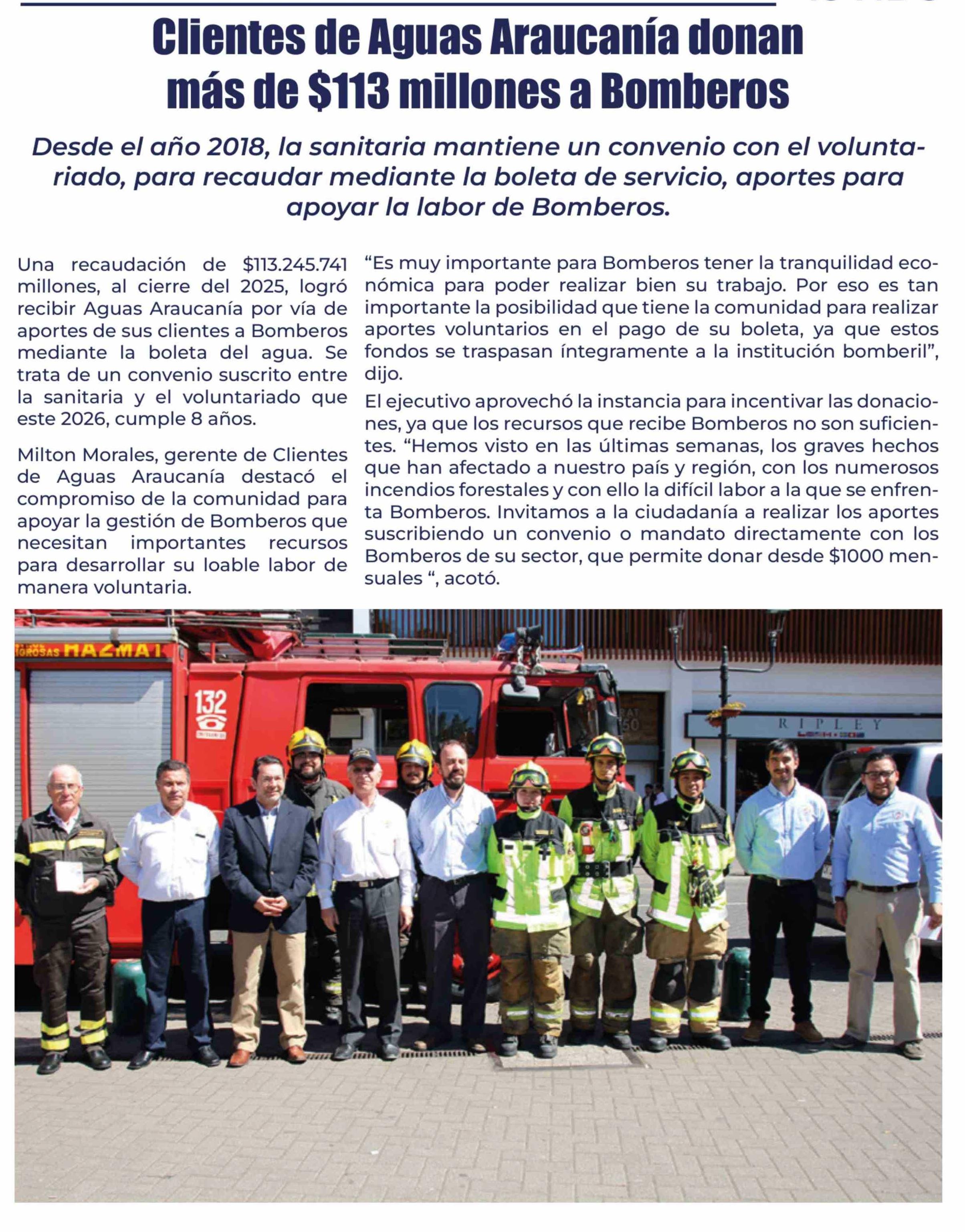 Título: Una recaudación de $113.245.741 "Es muy importante para Bomberos tener la tranquilidad ecomillones, al cierre del 2025, logró nómica para poder realizar bien su trabajo. Por eso es tan recibir Aguas Araucanía por vía de importante la posibilidad que tiene la comunidad para realizar aportes de sus cl