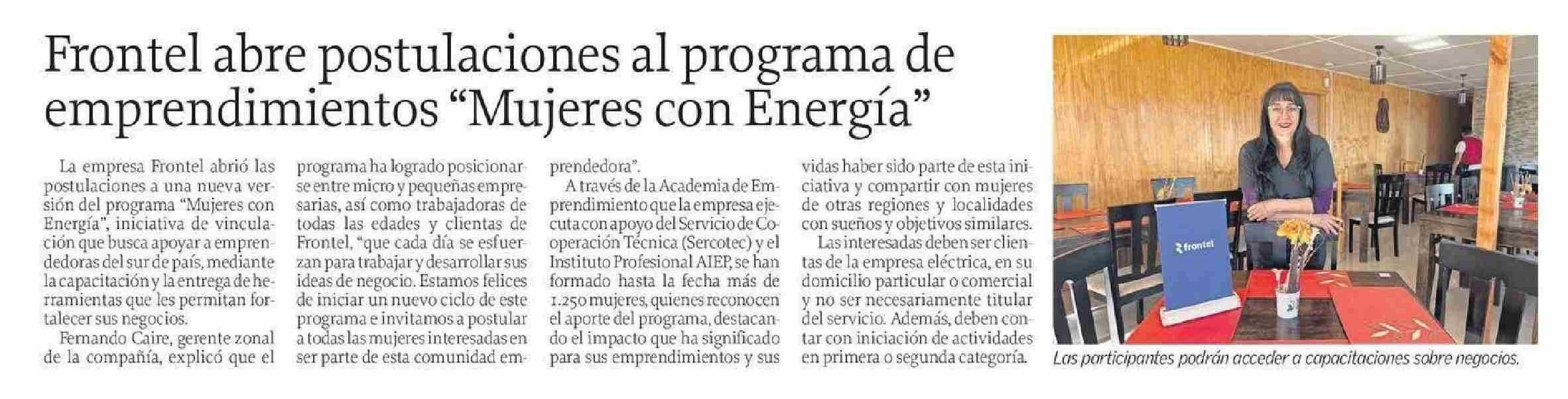 Frontel abre postulaciones al programa de emprendimientos “Mujeres con Energía” 27-05-2025 El Sur |