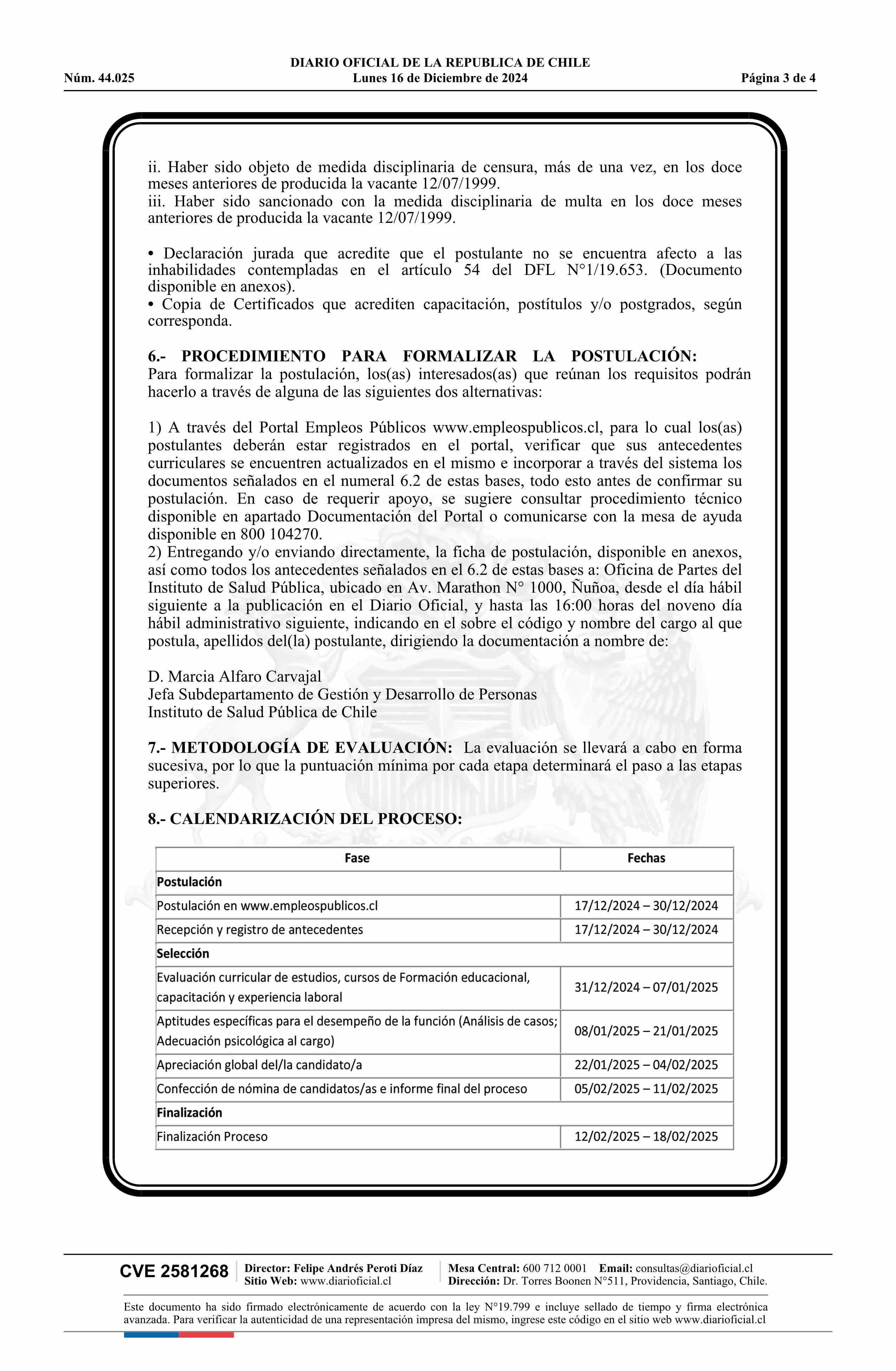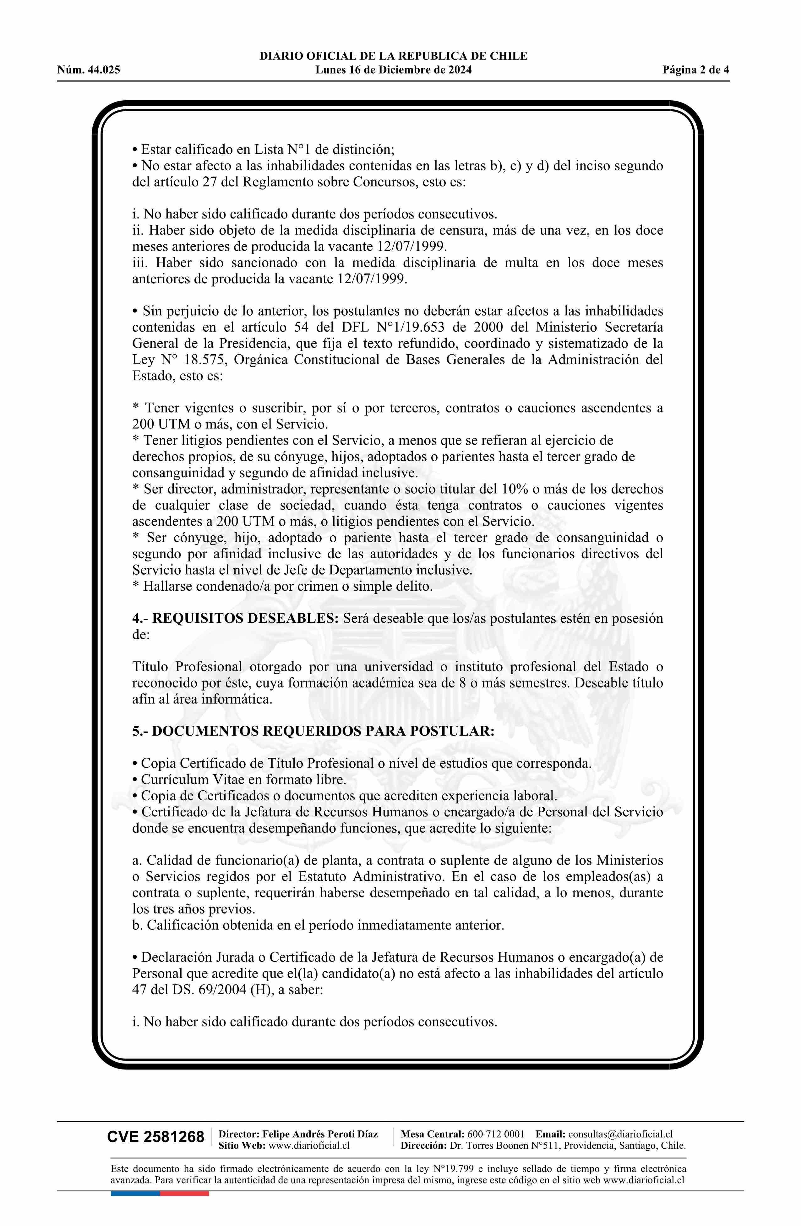 AVISO LICITACIONES: Llama a concurso público para la provisión del cargo de Jefe de Departamento 16-12-2024 Diario Oficial Edición Electrónica |