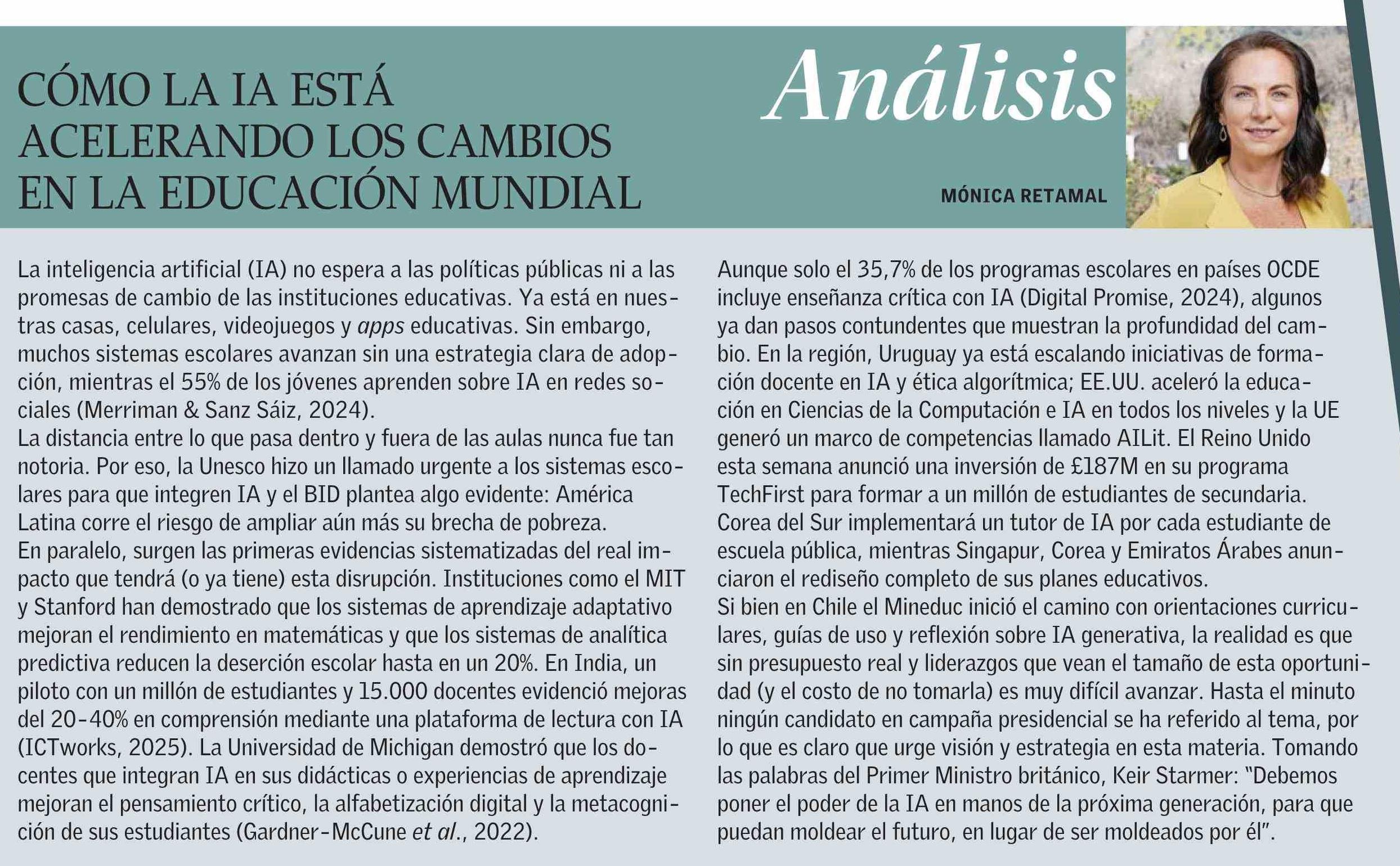 CÓMO LA IA ESTÁ ACELERANDO LOS CAMBIOS EN LA EDUCACIÓN MUNDIAL 23-06-2025 El Mercurio |