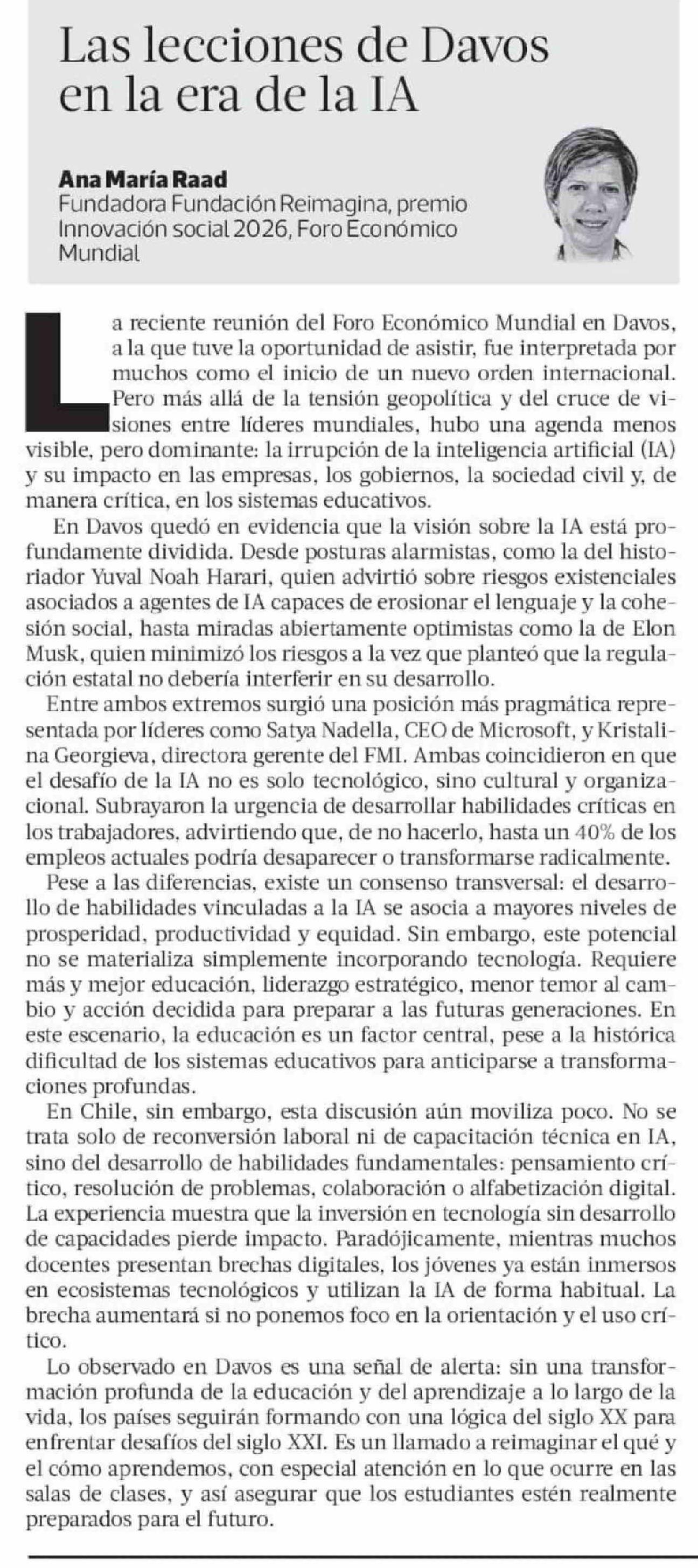 Columnas de Opinión: Las lecciones de Davos en la era de la IA 24-02-2026 La Tercera |