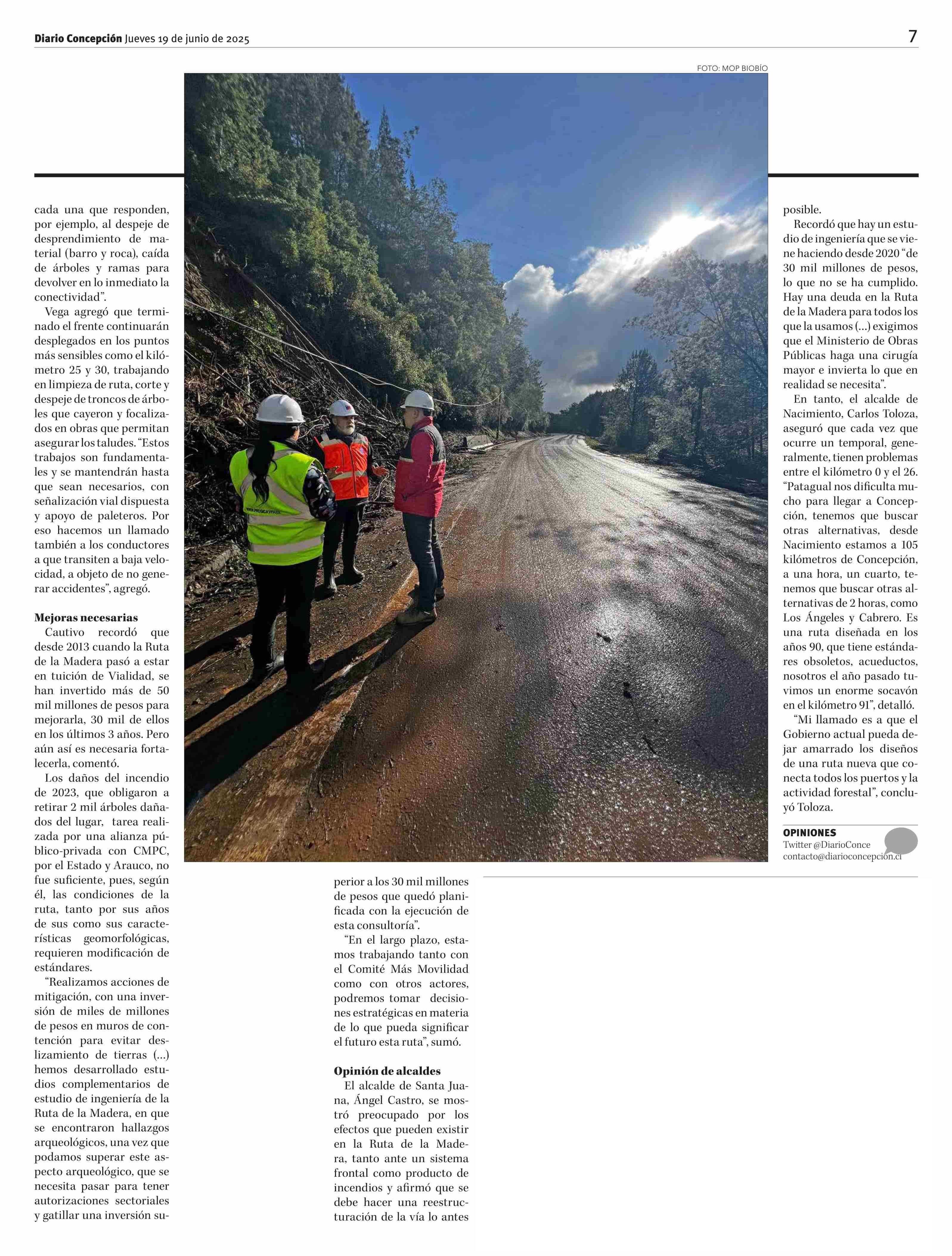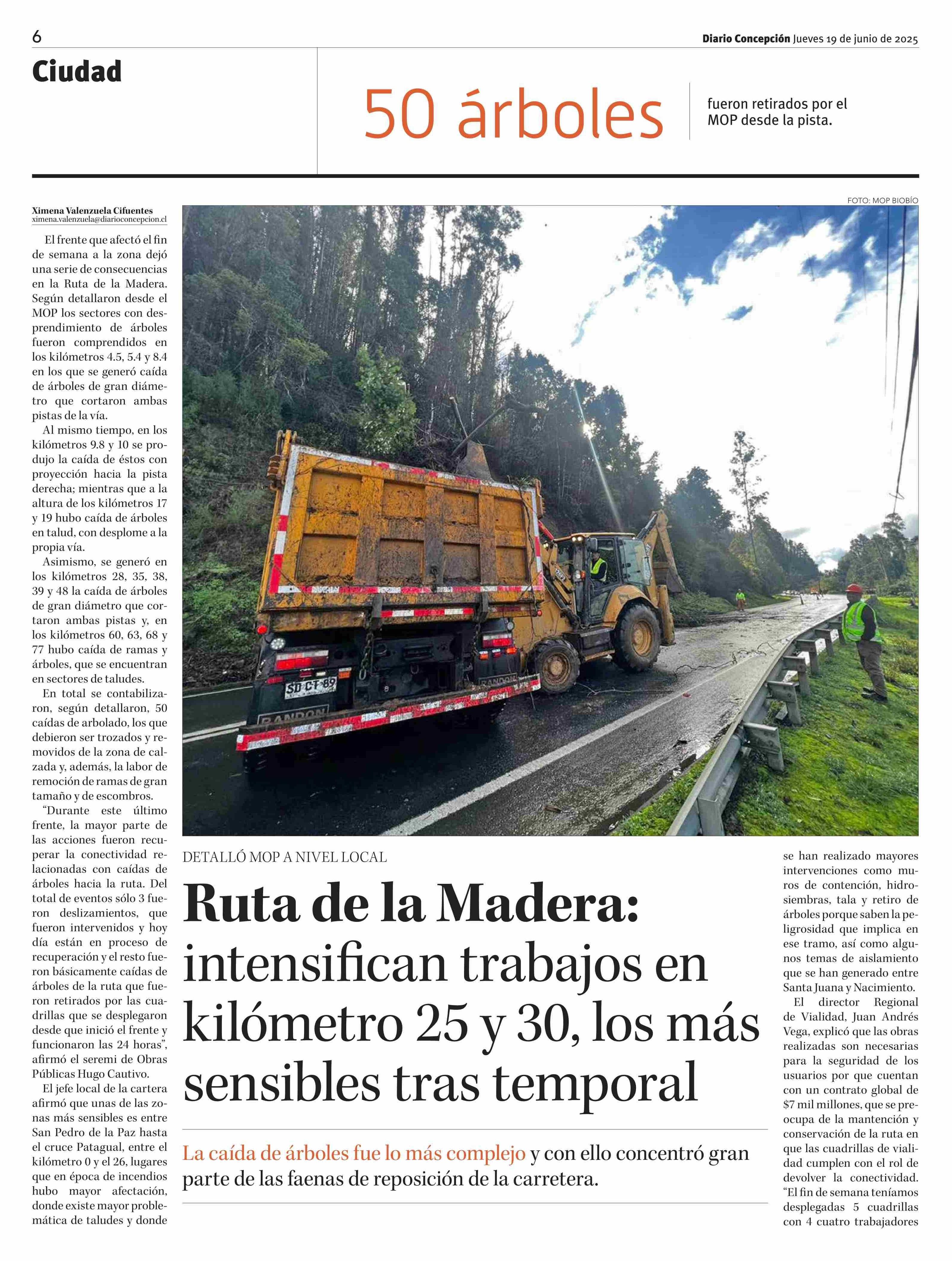 Ruta de la Madera: intensifican trabajos en kilómetro 25 y 30, los más sensibles tras temporal 19-06-2025 Diario Concepción |