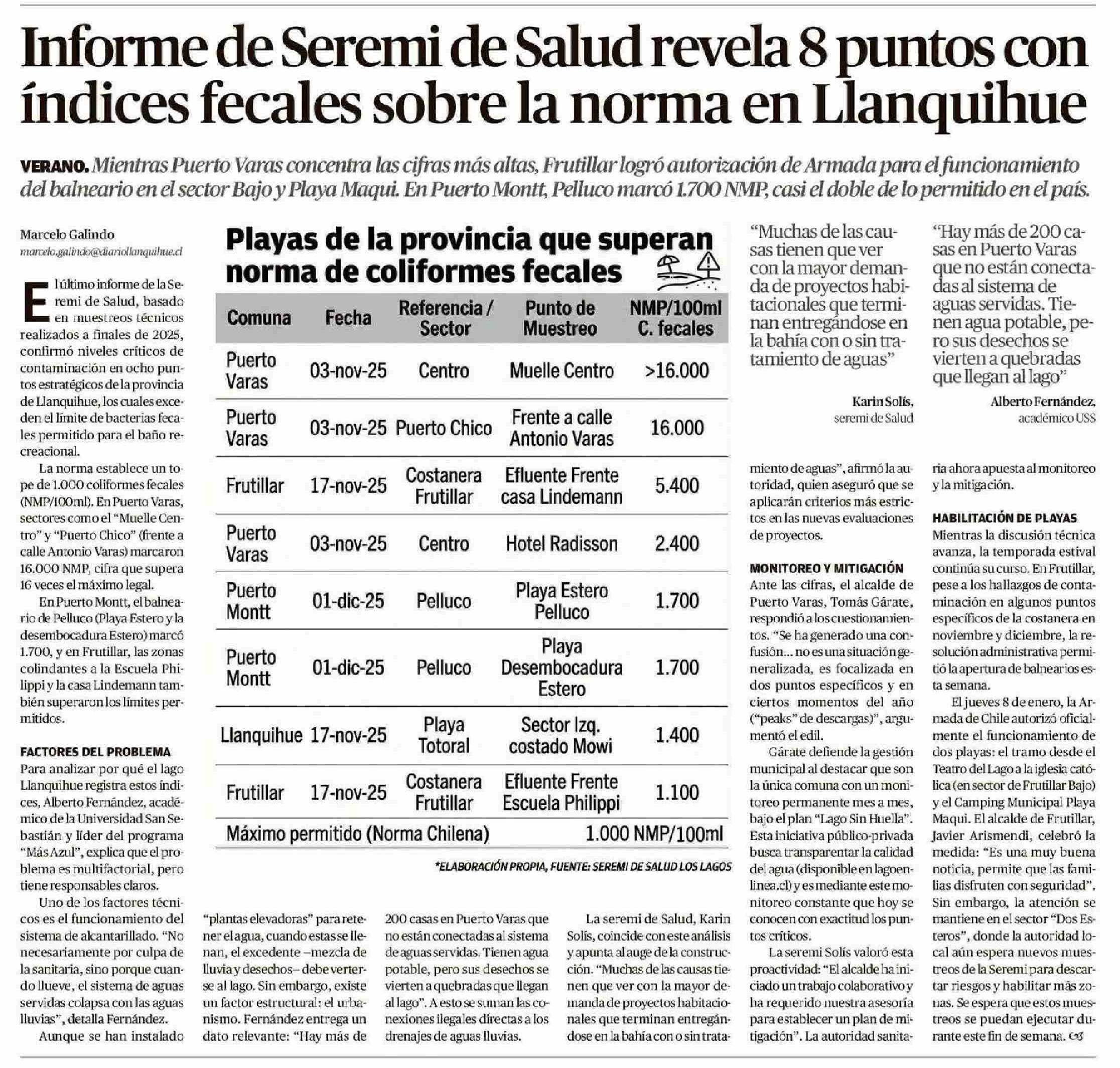 Título: Informe de Seremi de Salud revela 8 puntos con índices fecales sobre la norma en Llanquihue