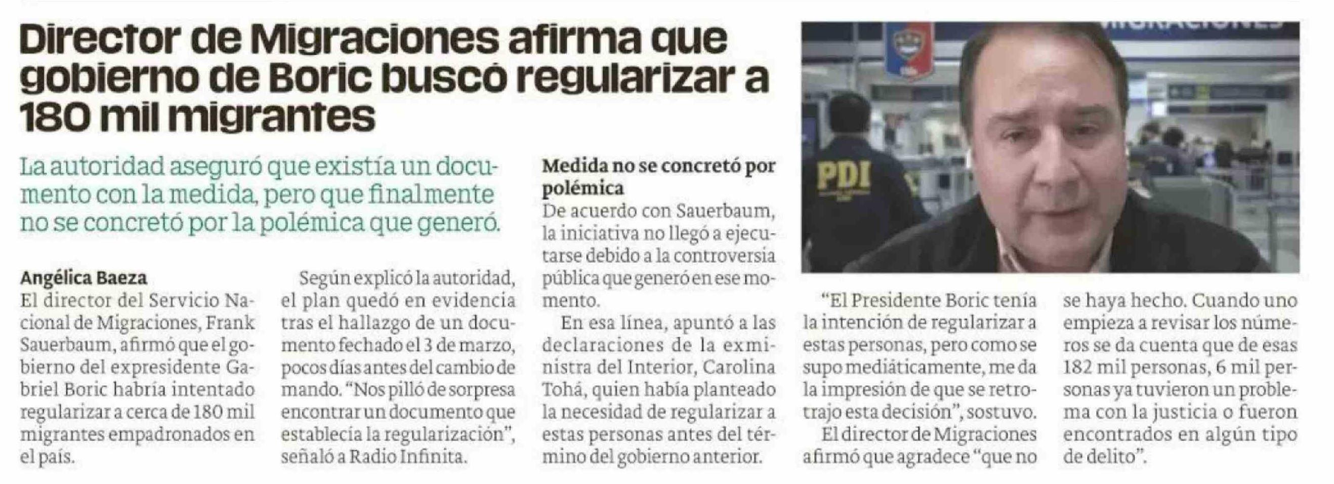| Título: | Director de Migraciones afirma que gobierno de Boric busco regularizar a 180 mil migrantes |