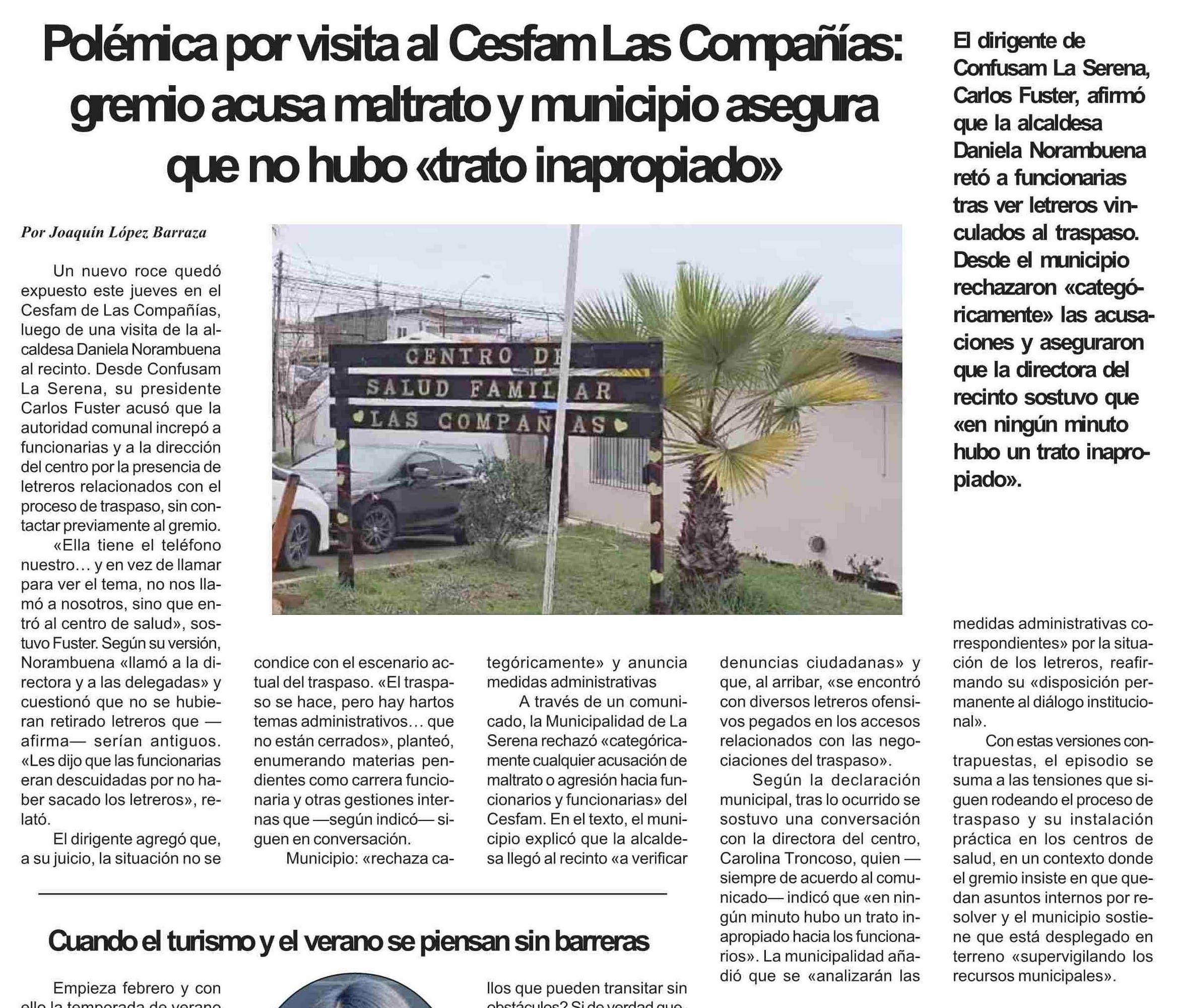| Título: | Polémica por visita al Cesfam Las Compañías: gremio acusa maltrato y municipio asegura que no hubo «trato inapropiado» |