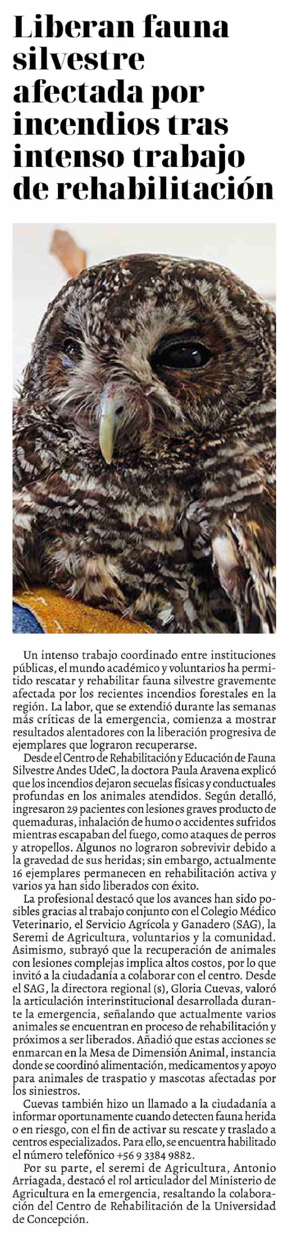 Liberan fauna silvestre afectada por incendios tras intenso trabajo de rehabilitación 20-02-2026 La Discusión |