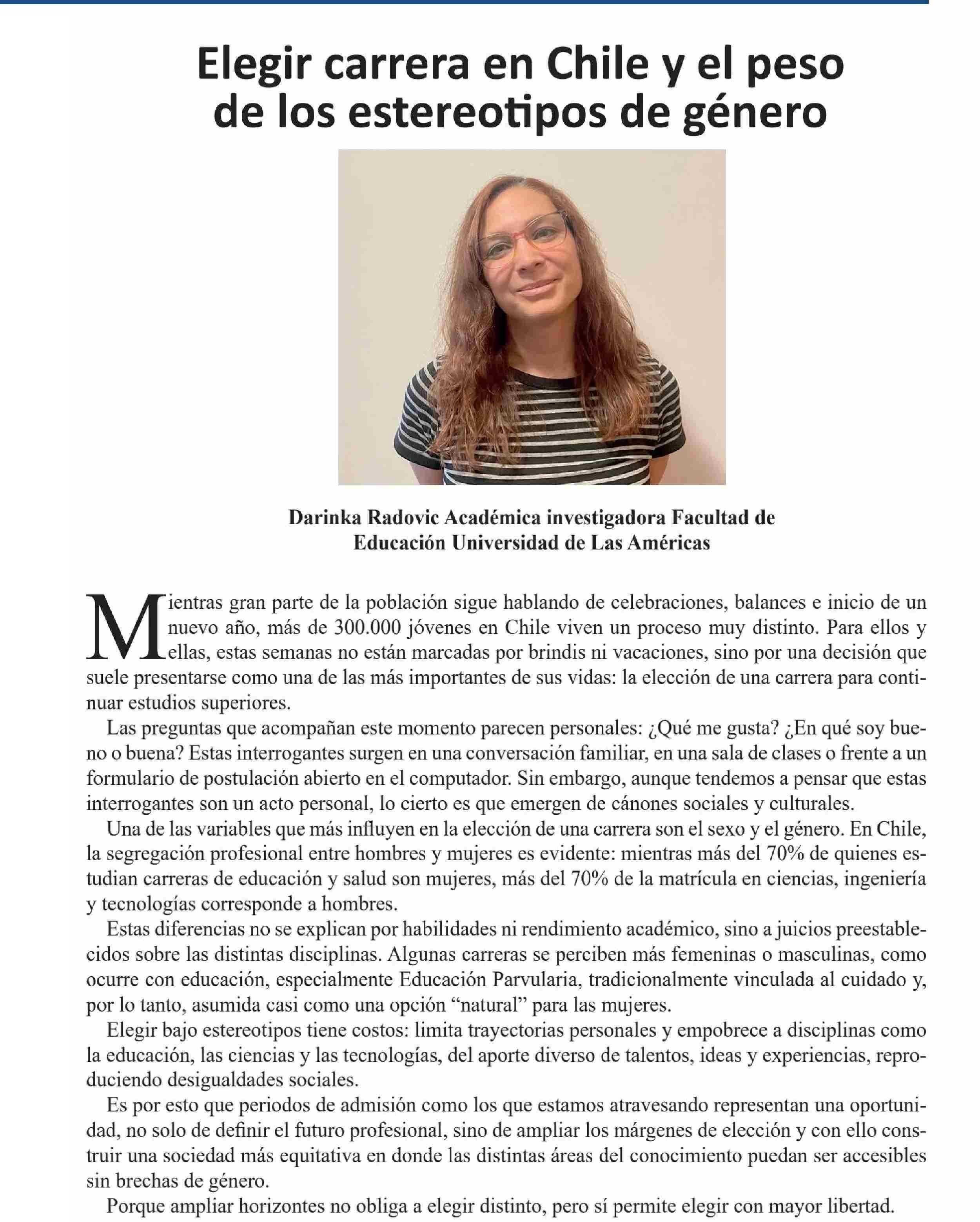 Título: COLUMNAS DE OPINIÓN: Elegir carrera en Chile y el peso de los estereotipos de género