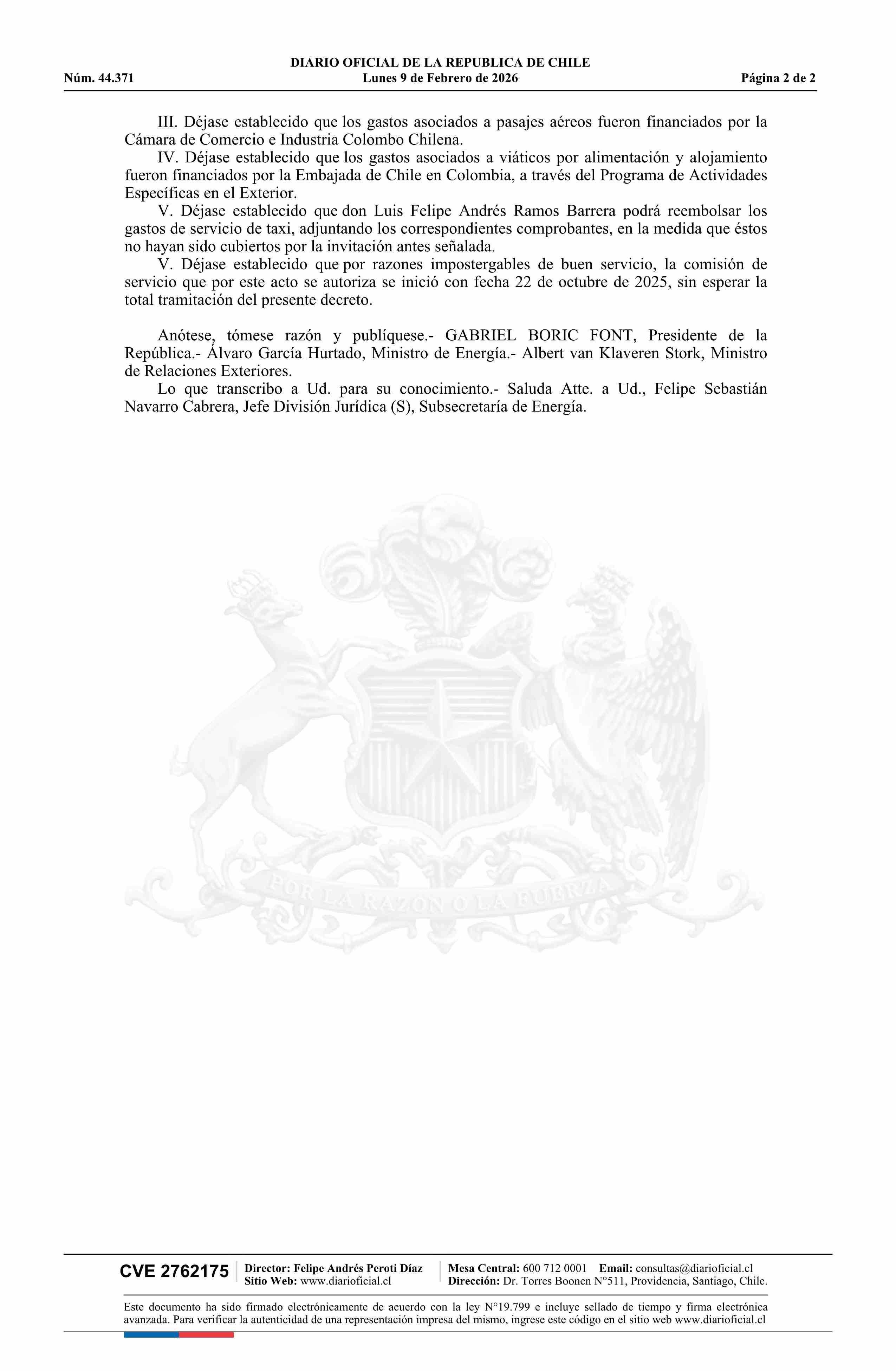 Decreto número 39, de 2025.- Autorizada comisión de servicio en el extranjero a don Luis Felipe Andrés Ramos Barrera, Subsecretario de Energía