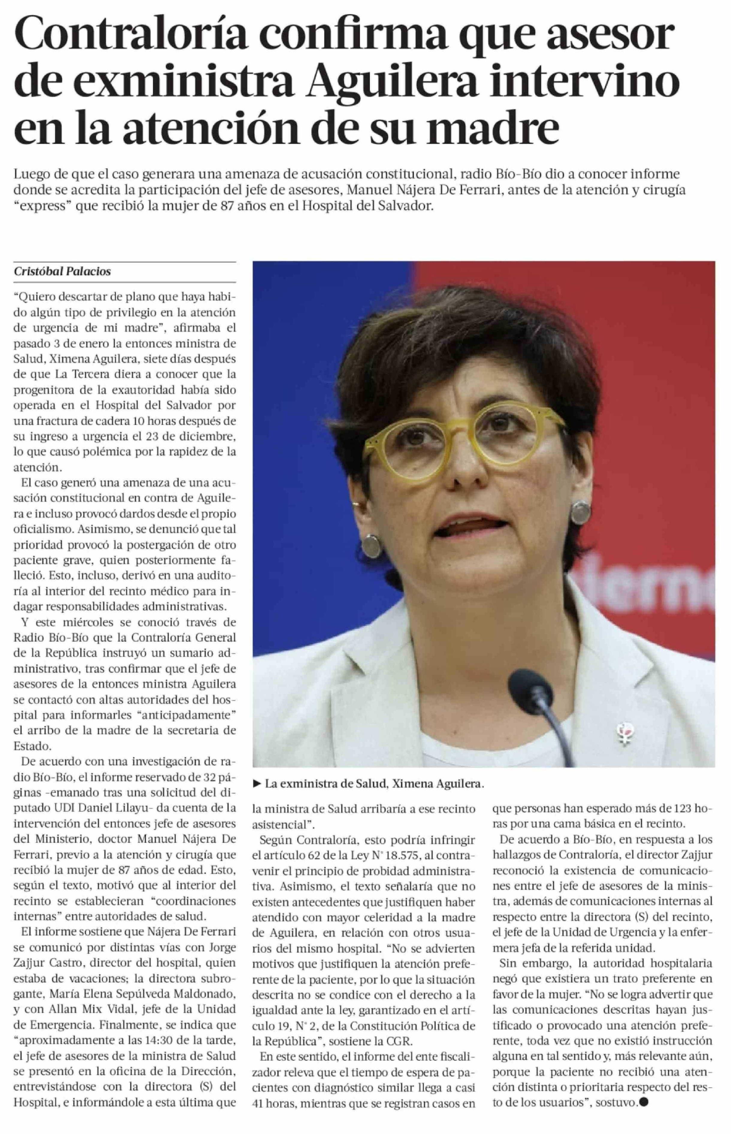 Título: Contraloría confirma que asesor de exministra Aguilera intervino en la atención de su madre