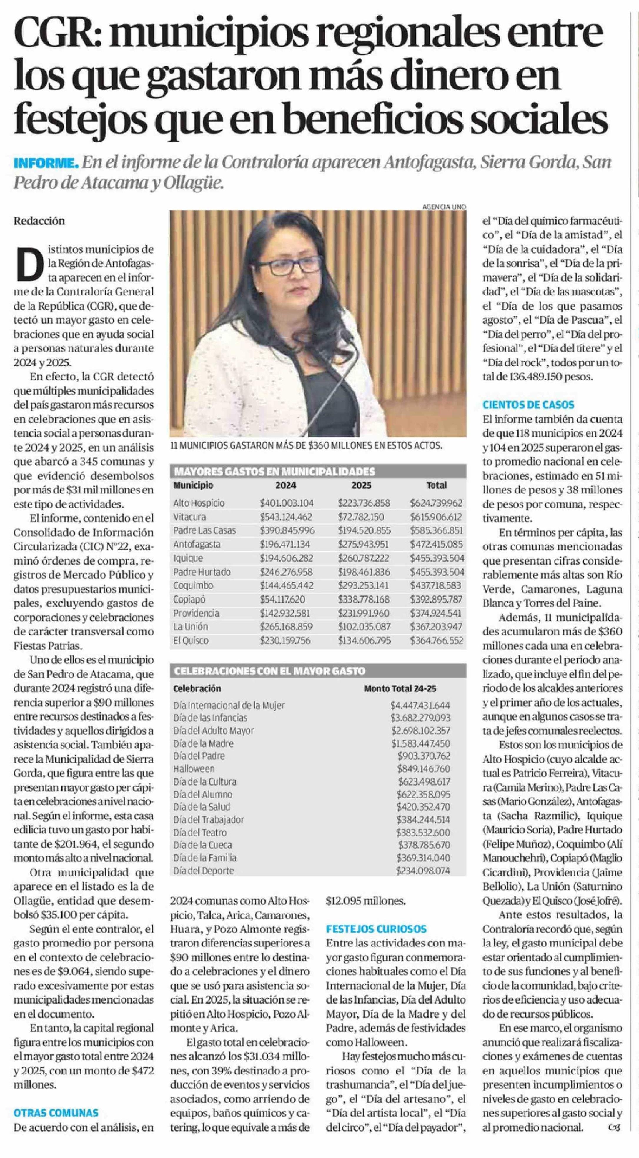 CGR: municipios regionales entre los que gastaron más dinero en festejos que en beneficios sociales 07-04-2026 El Mercurio de Calama |