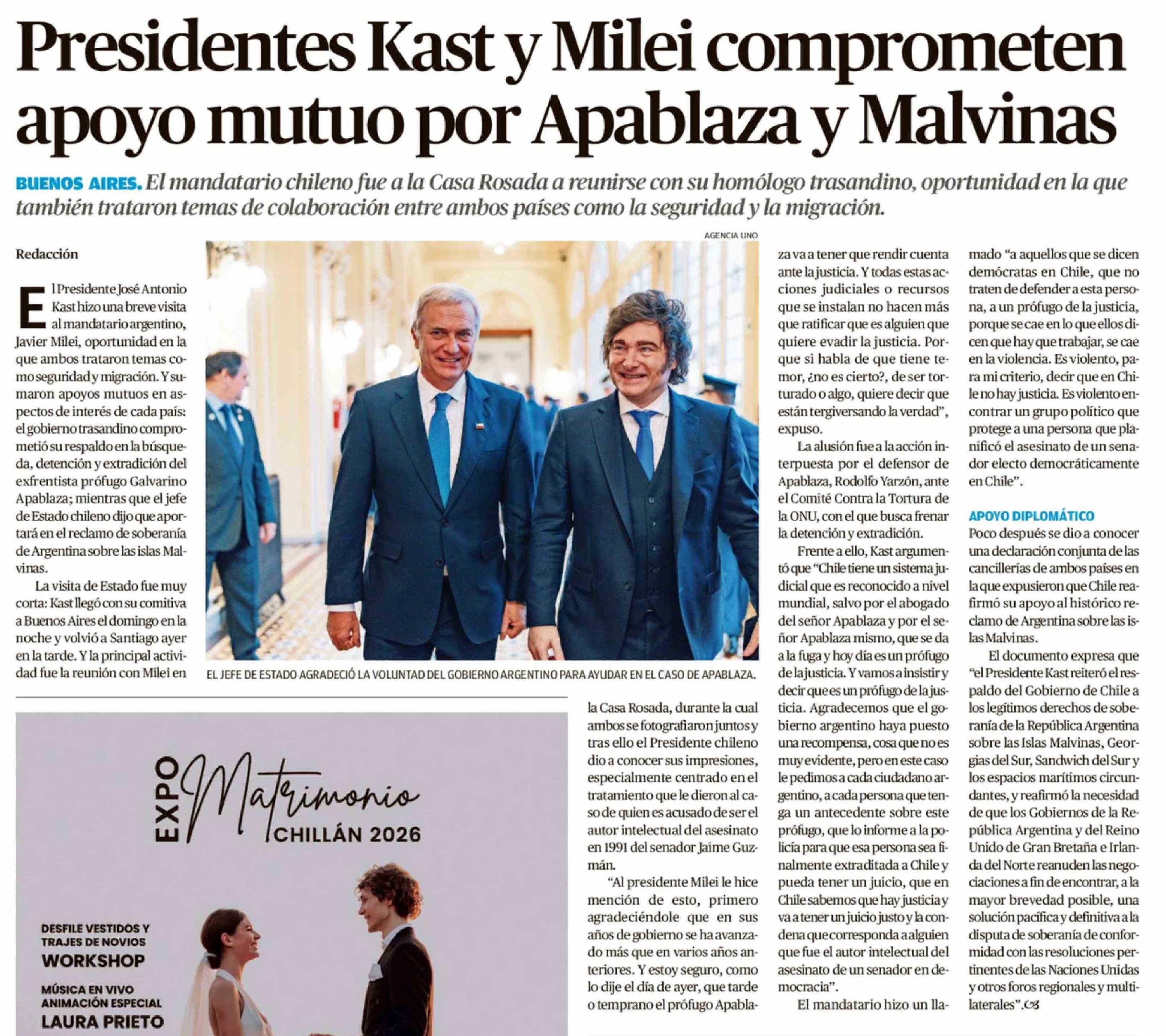 | Título: | Presidentes Kast y Milei comprometen apoyo mutuo por Apablaza y Malvinas |