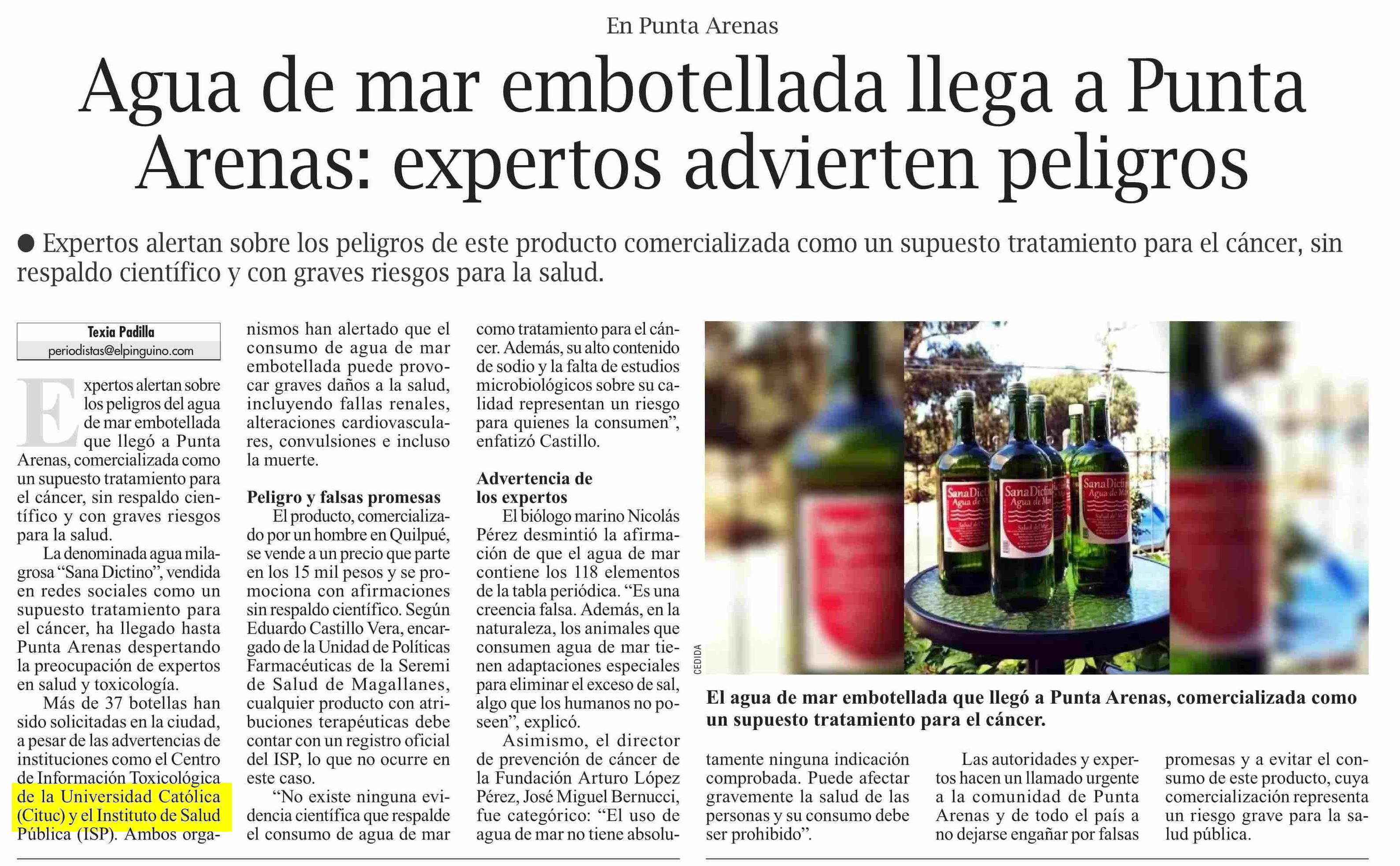 | Título: | Agua de mar embotellada llega a Punta Arenas: expertos advierten peligros |