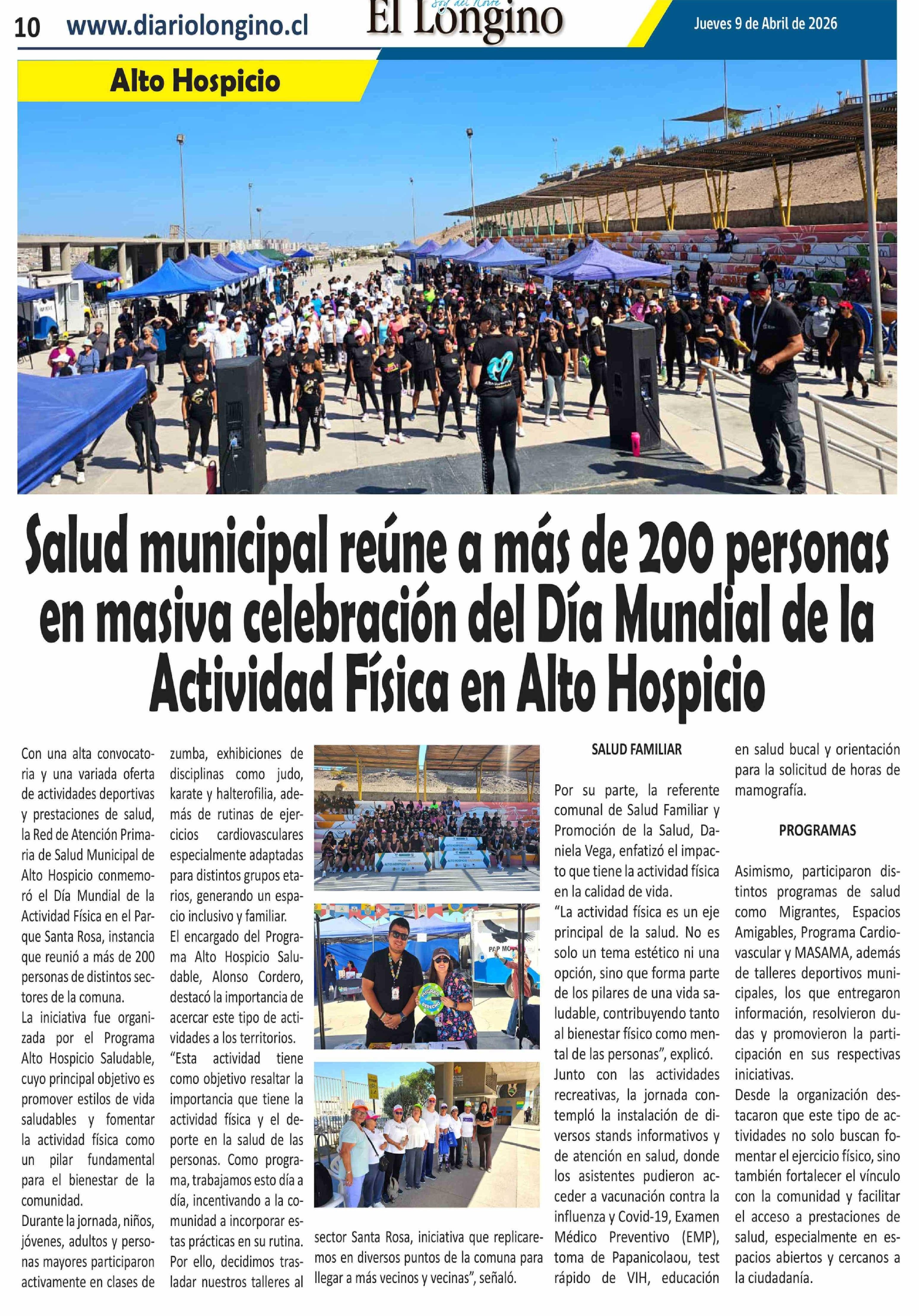 Salud municipal reúne a más de 200 personas en masiva celebración del Día Mundial de la Actividad Física en Alto Hospicio 09-04-2026 El Longino |