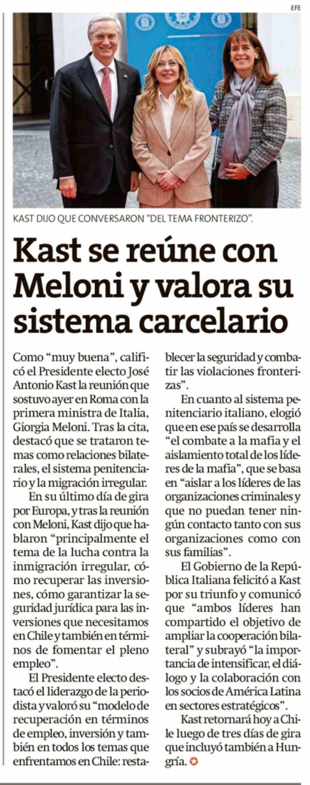 | Título: | Kast se reúne con Meloni y valora su sistema carcelario |