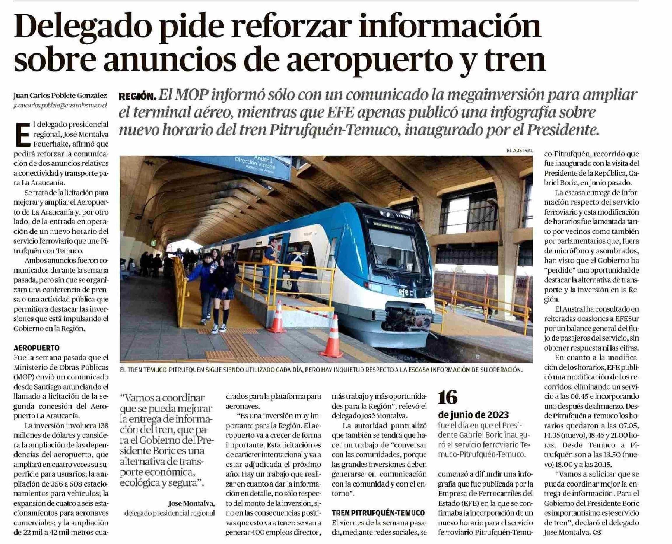 Delegado pide reforzar información sobre anuncios de aeropuerto y tren 07-11-2023 El Austral de la Araucanía |