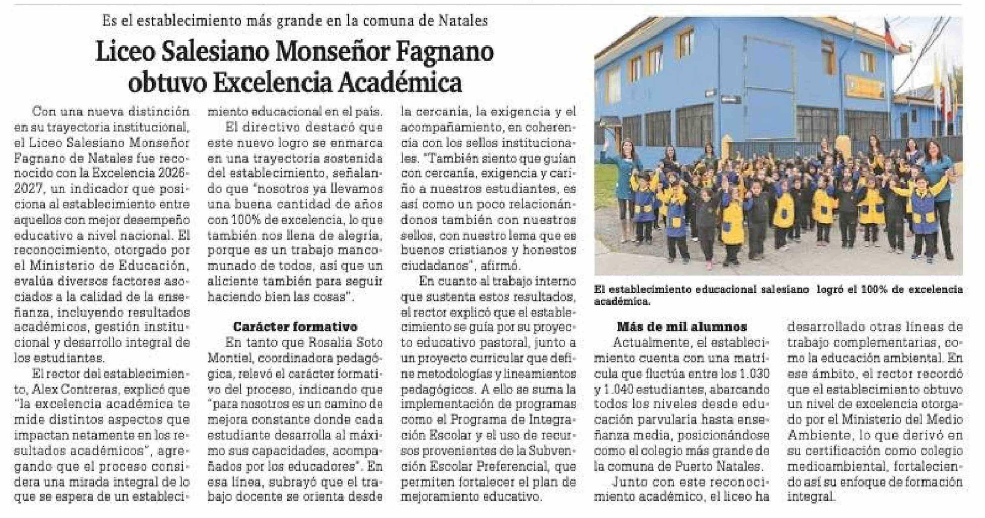 | Título: | Liceo Salesiano Monseñor Fagnano obtuvo Excelencia Académica |
