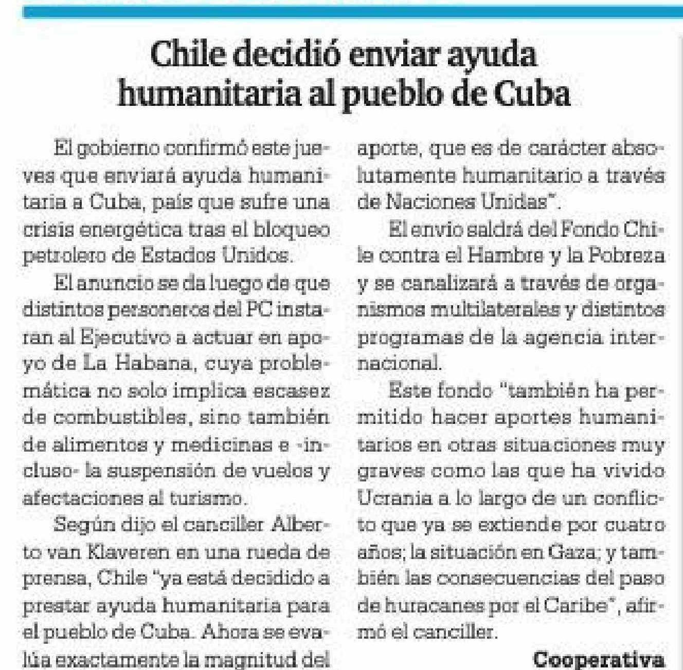 Humanitaria al pueblo de Cuba El gobierno confirmó este jue- aporte, que es de carácter abac ves que enviará ayuda humanilutamente humanitario a través 13-02-2026 La Prensa Austral |
