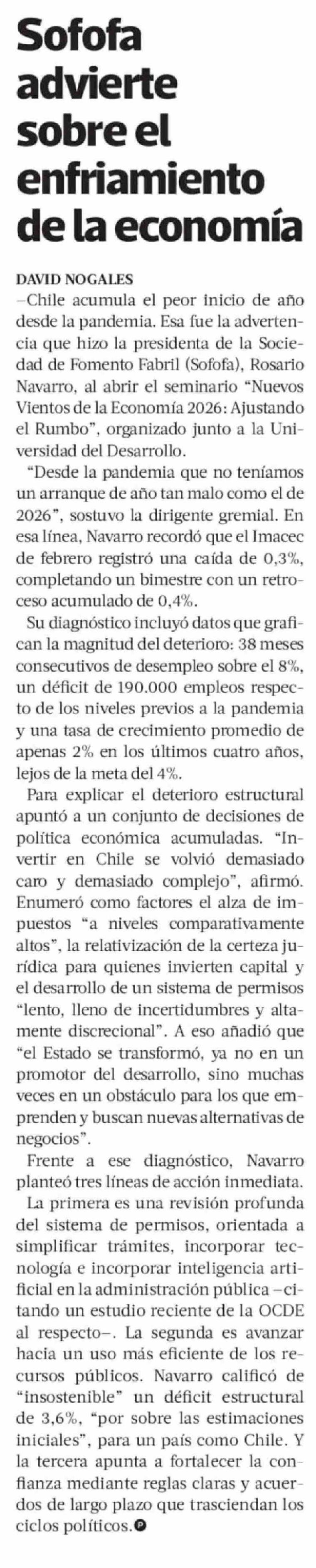 Sofofa advierte sobre el enfriamiento de la economía 08-04-2026 La Tercera |