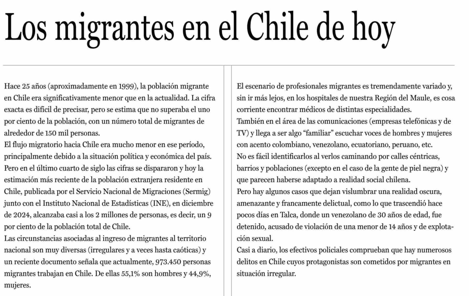 EDITORIAL: Los migrantes en el Chile de hoy 08-06-2025 La Prensa de Curicó |