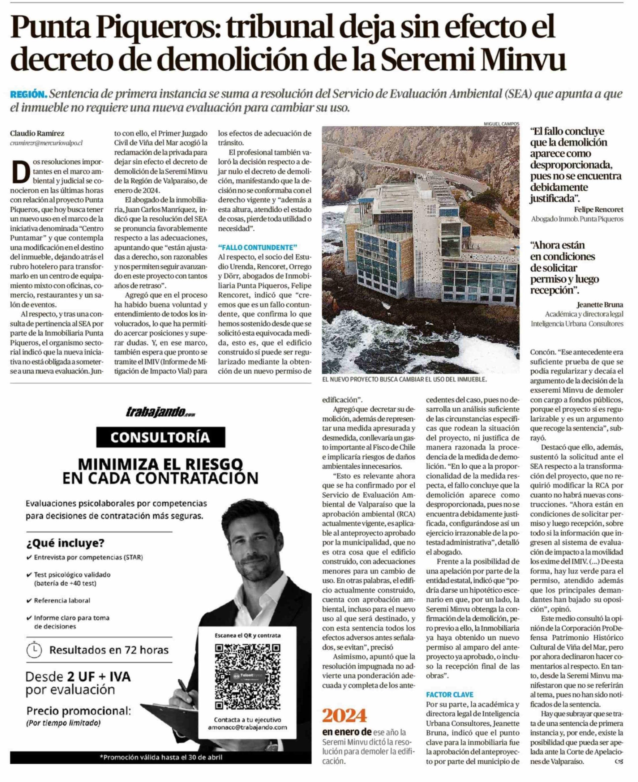 Punta Piqueros: tribunal deja sin efecto el decreto de demolición de la Seremi Minvu 09-04-2026 El Mercurio de Valparaíso |