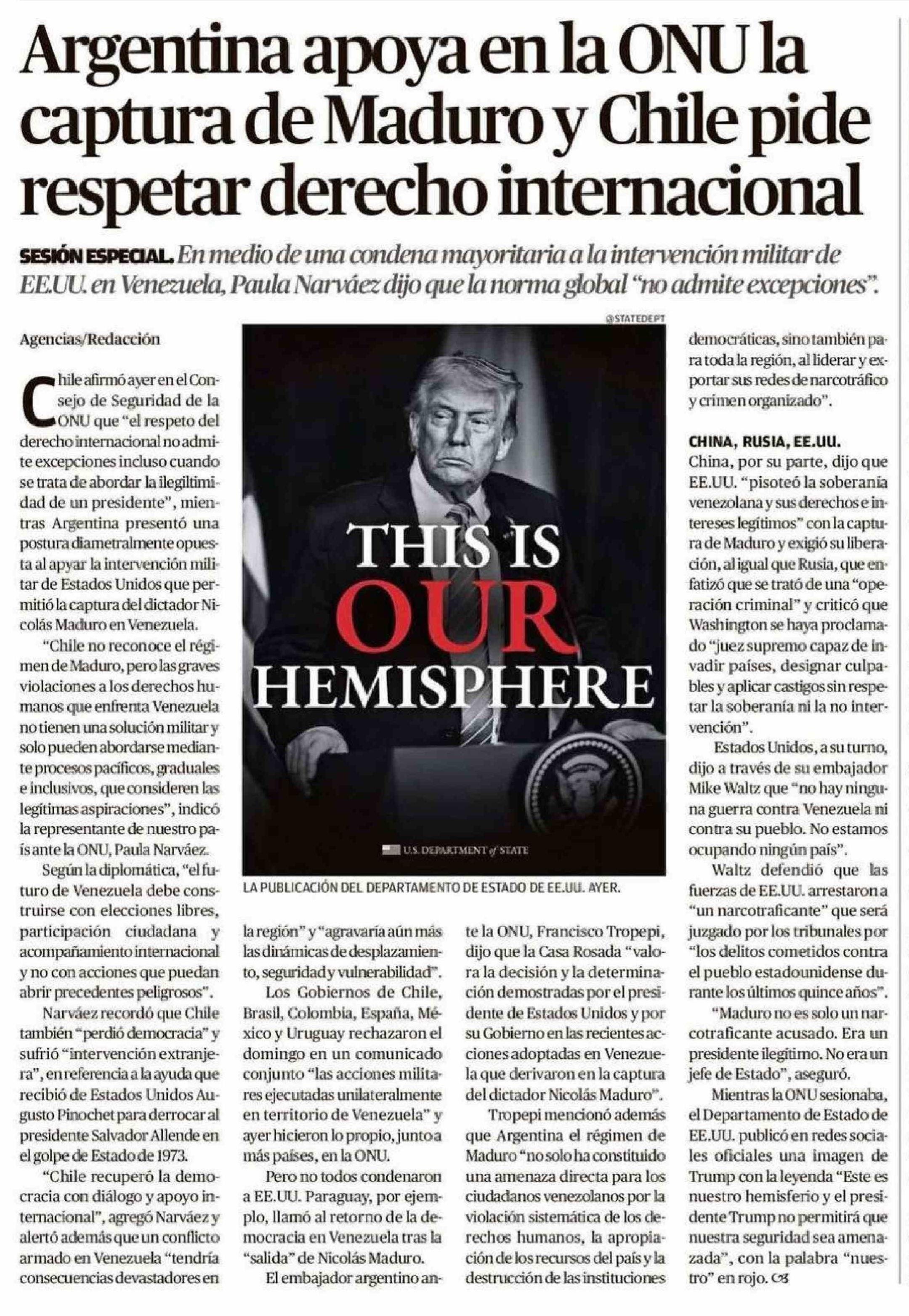 Título: Argentina apoya en la ONU la captura de Maduro y Chile pide respetar derecho internacional