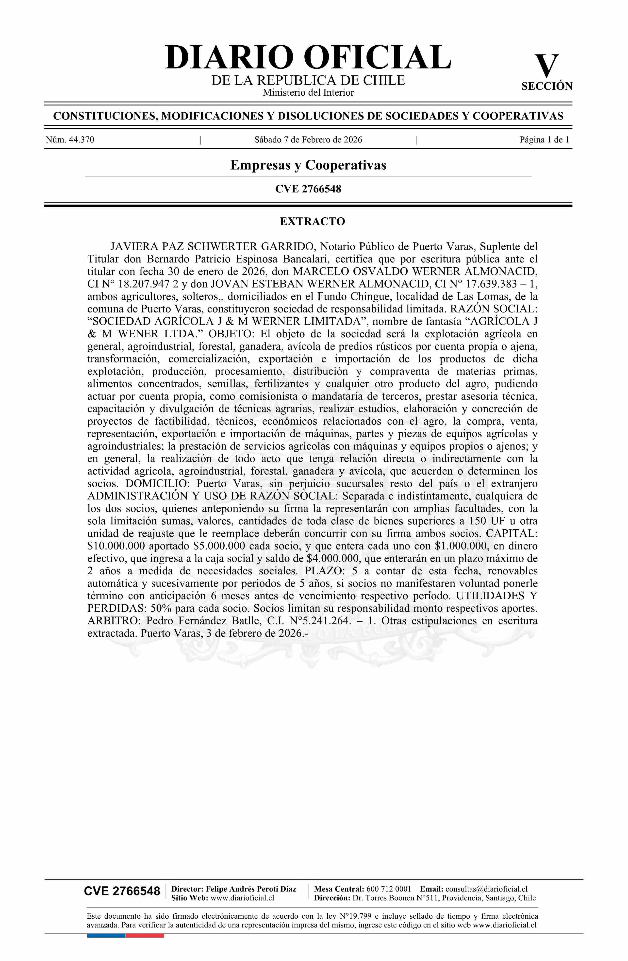 SOCIEDAD AGRÍCOLA J & M WERNER LIMITADA 07-02-2026 Diario Oficial Edición Electrónica |