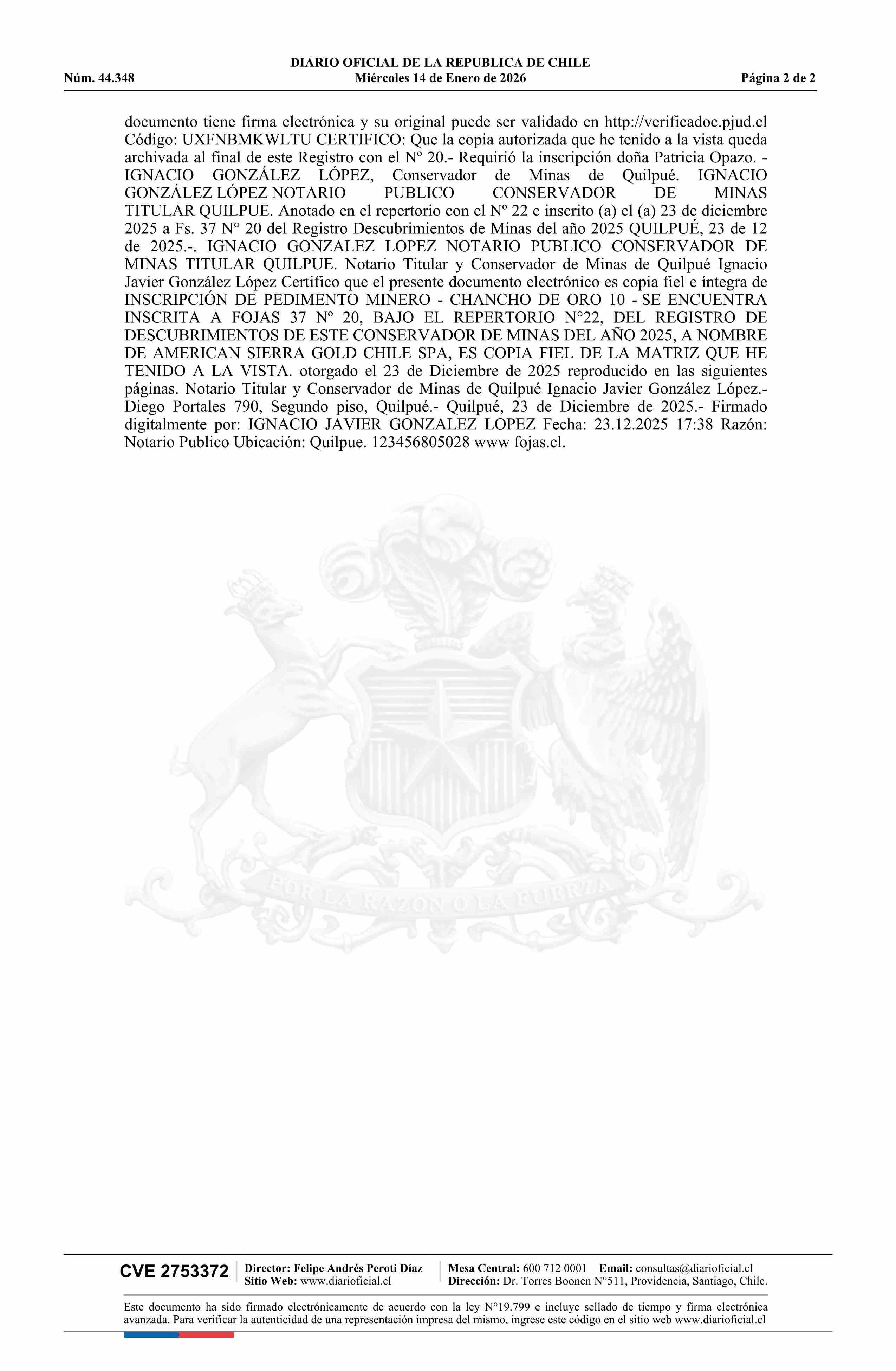 CHANCHO DE ORO 10 / American Sierra Gold Chile SpA 14-01-2026 DIARIO OFICIAL CHILE - BOLETÍN OFICIAL DE MINERÍA |