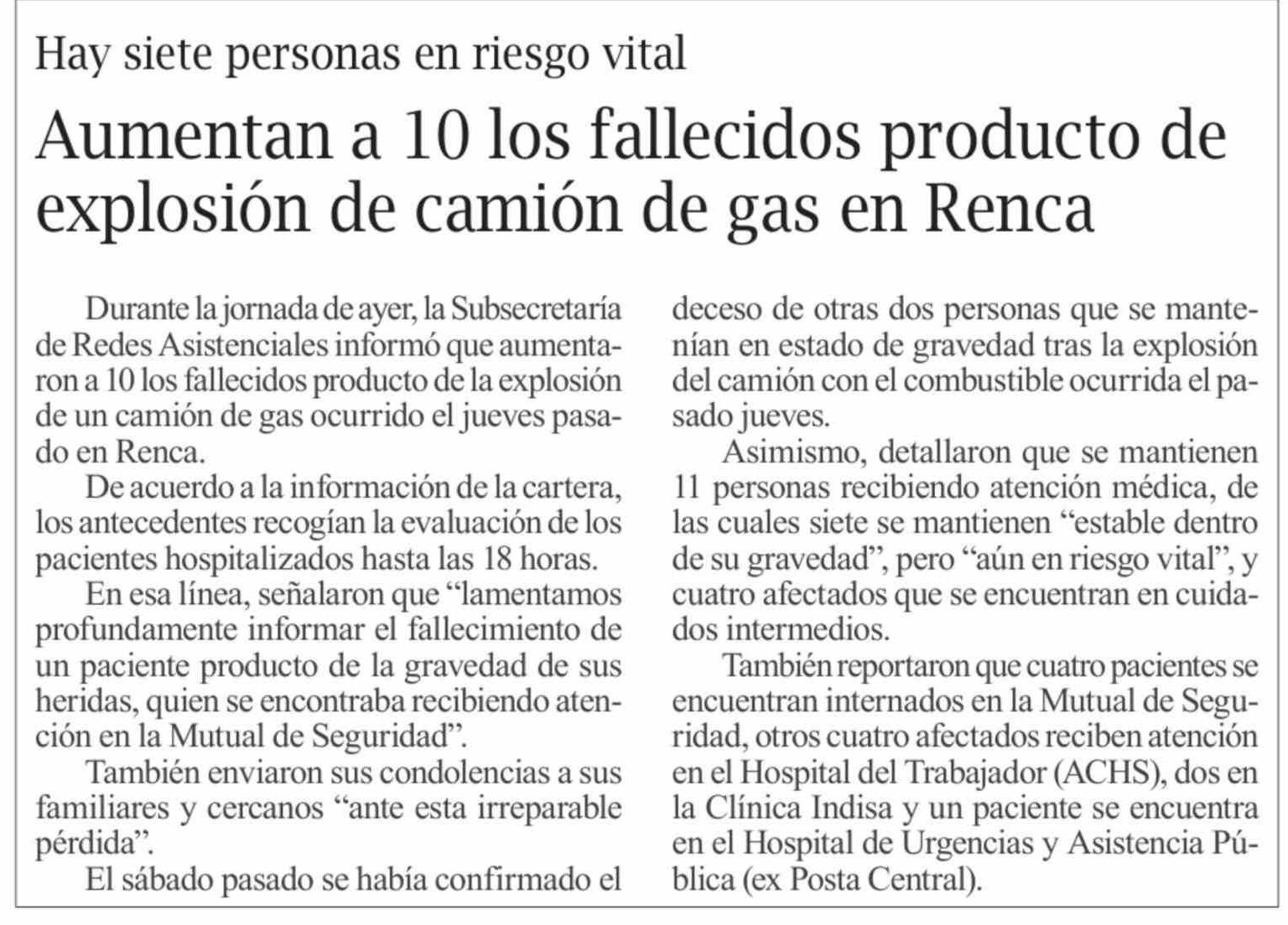 Título: Aumentan a 10 los fallecidos producto de explosión de camión de gas en Renca