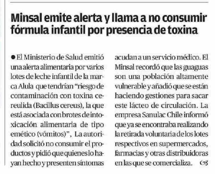 | Título: | Minsal emite alerta y llama a no consumir fórmula infantil por presencia de toxina |