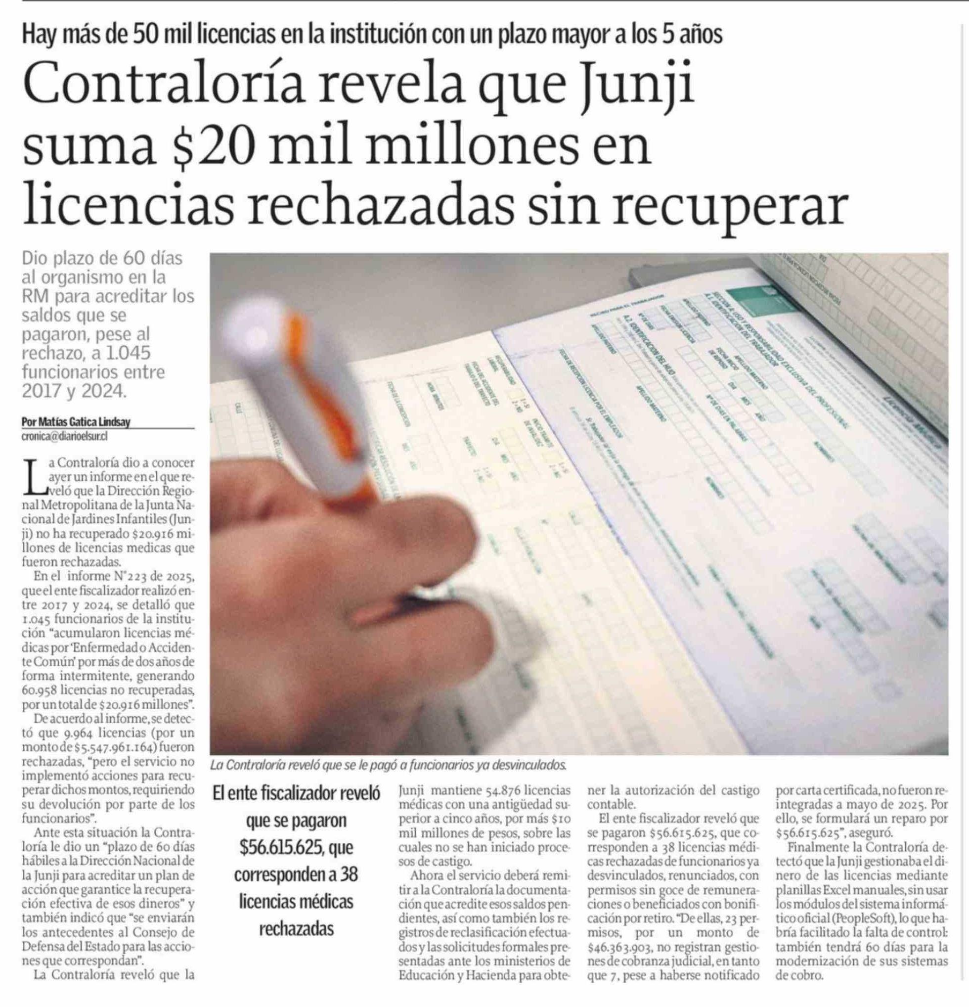 Contraloría revela que Junji suma $20 mil millones en licencias rechazadas sin recuperar 10-02-2026 El Sur |