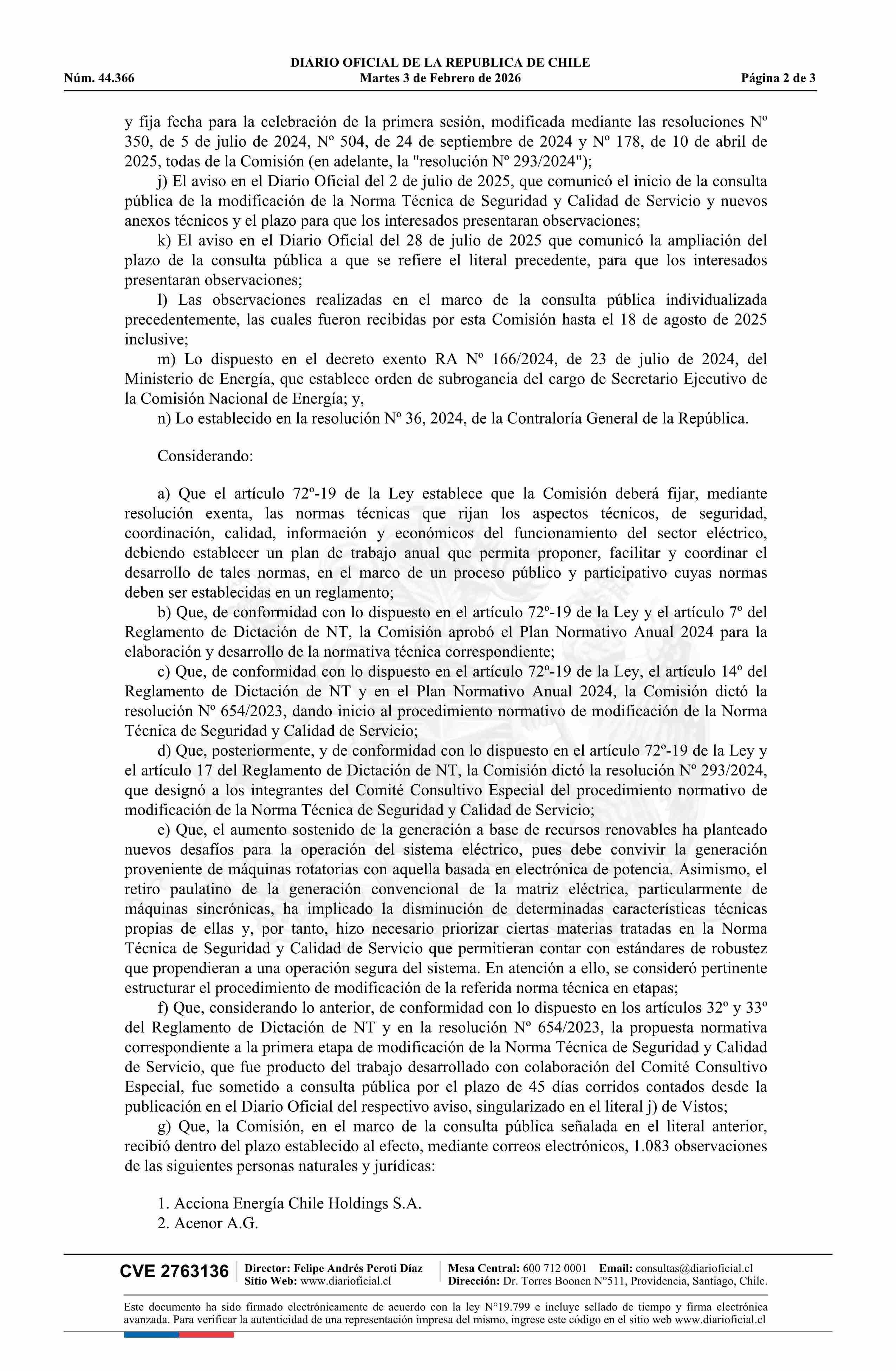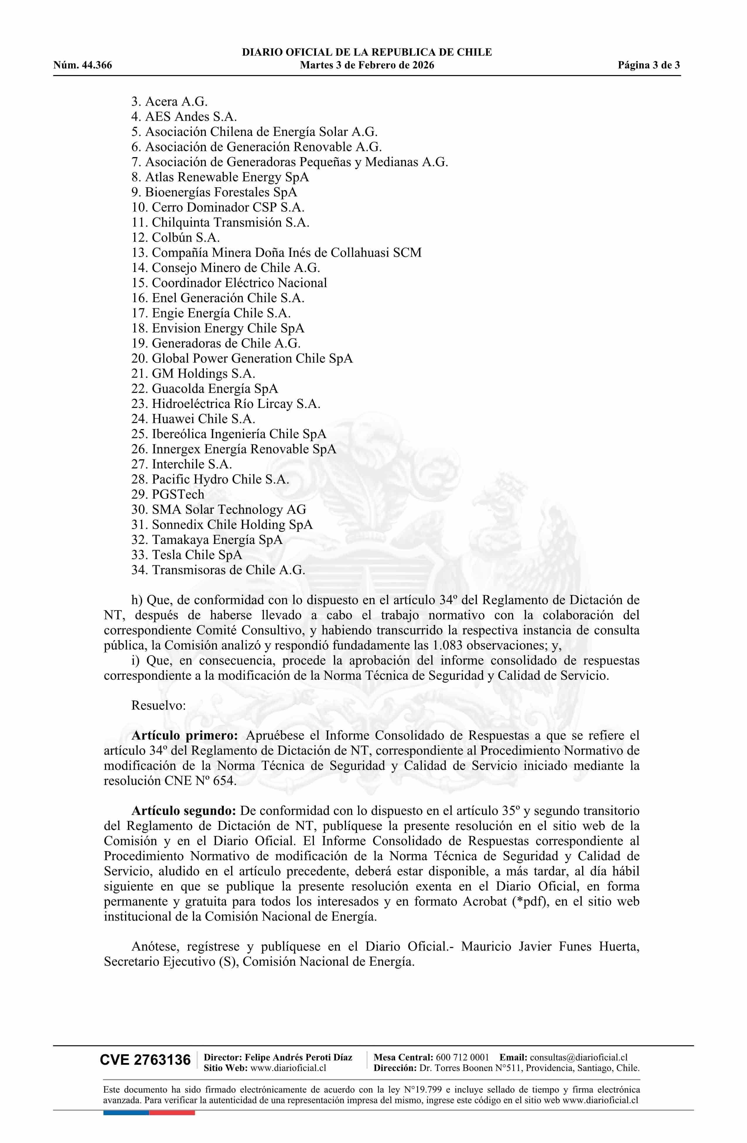 Título: Resolución exenta número 44, de 2026.- Aprueba Informe Consolidado de Respuestas del proceso de consulta pública correspondiente al procedimiento normativo de la modificación de la Norma Técnica de Seguridad y Calidad de Servicio, en conformidad con lo dispuesto en el artículo 72°-19 de la Ley Gener