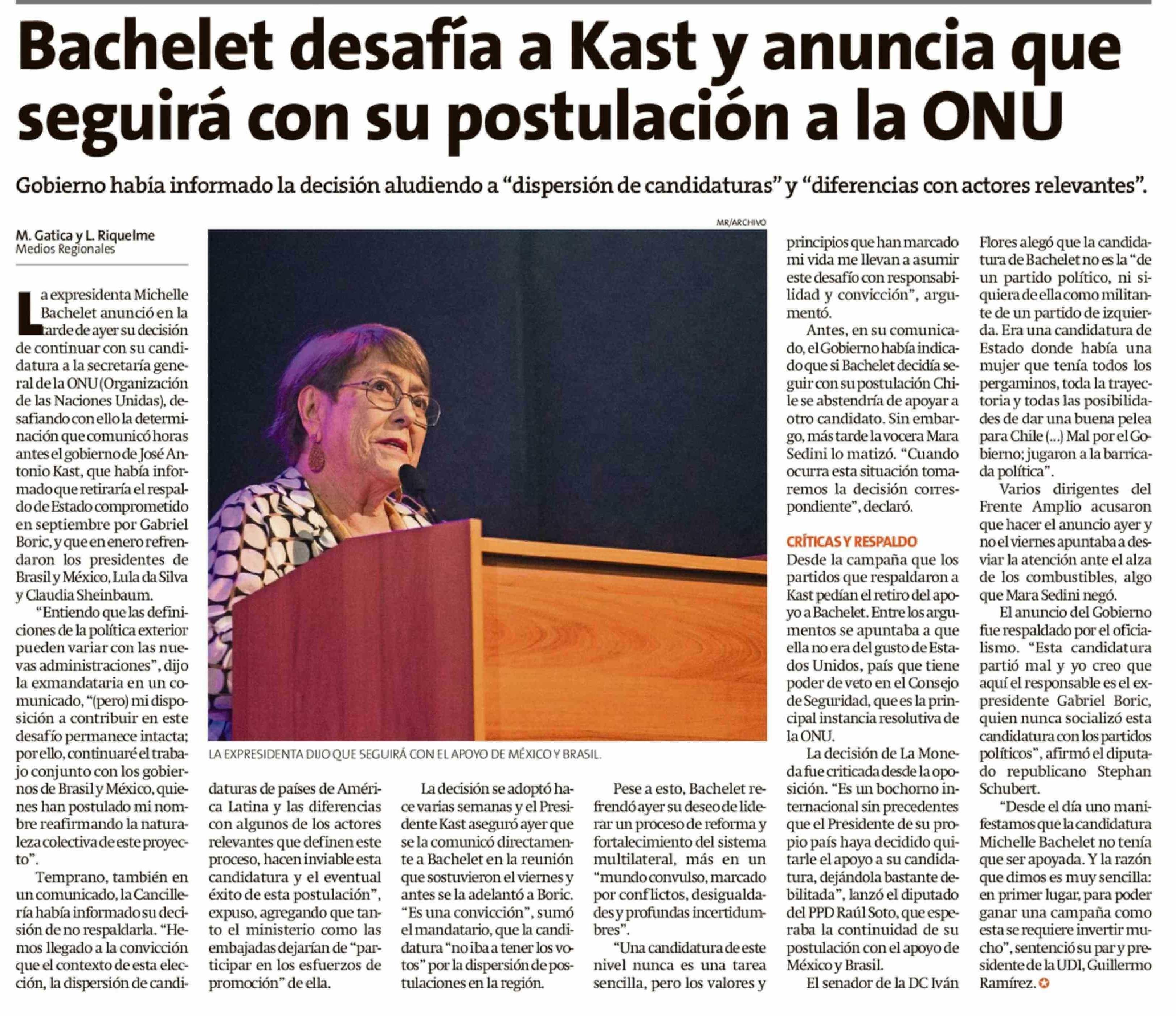 | Título: | Bachelet desafía a Kast y anuncia que seguirá con su postulación a la ONU |