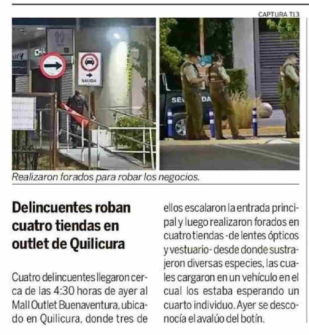 | Título: | Delincuentes roban cuatro tiendas en outlet de Quilicura |