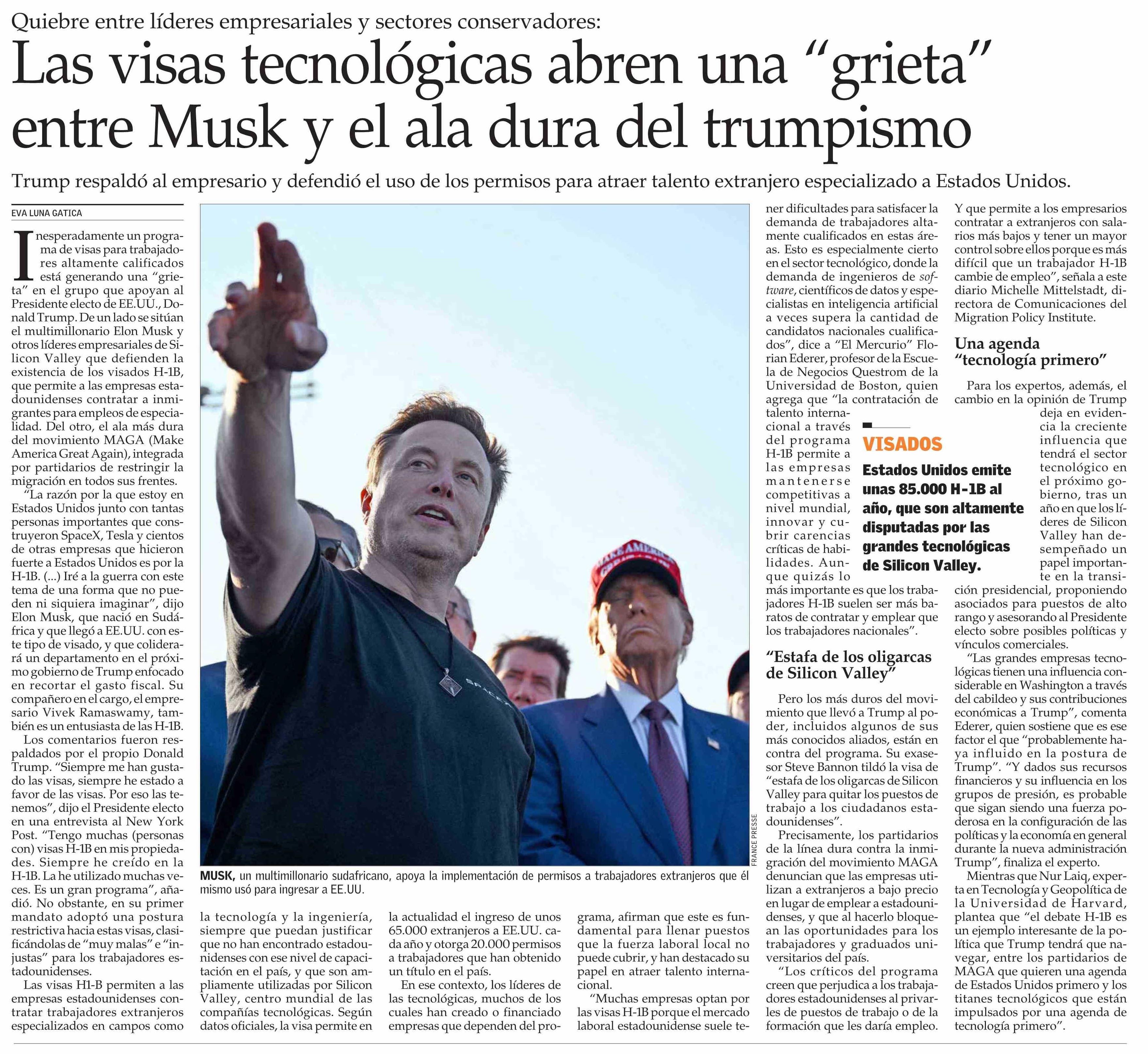 Las visas tecnológicas abren una “grieta” entre Musk y el ala dura del trumpismo 04-01-2025 El Mercurio |