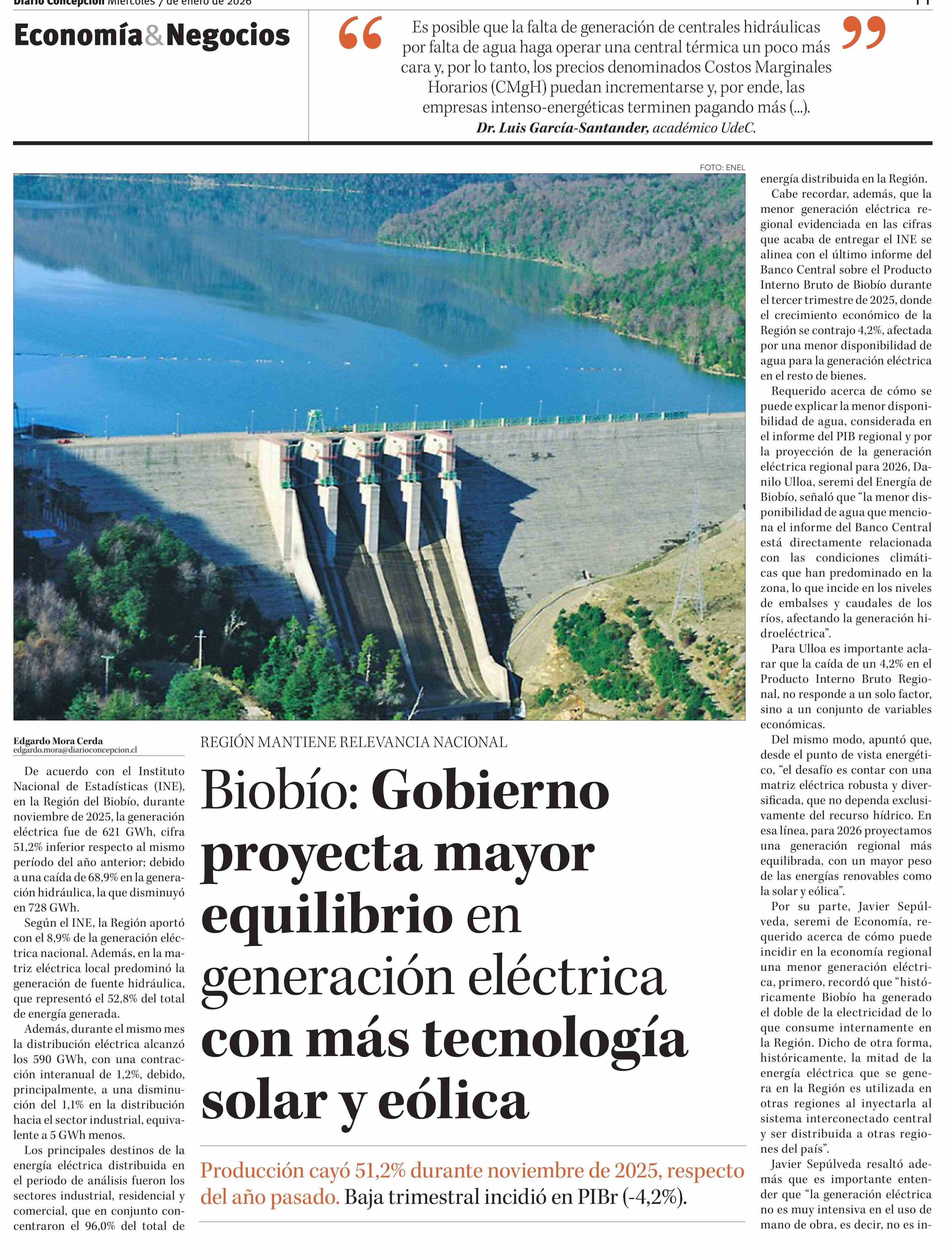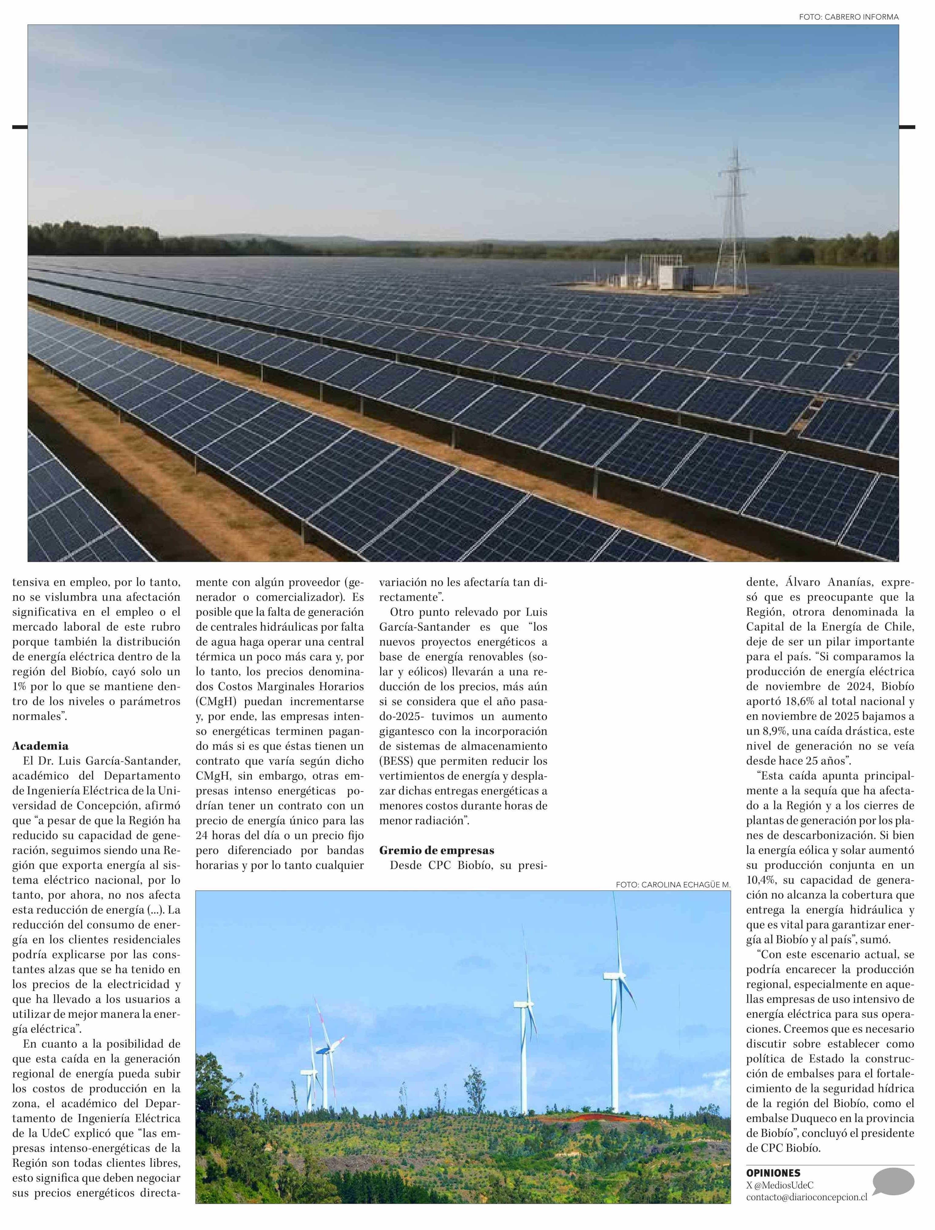 Biobío: Gobierno proyecta mayor equilibrio en generación eléctrica con más tecnología solar y eólica 07-01-2026 Diario Concepción |