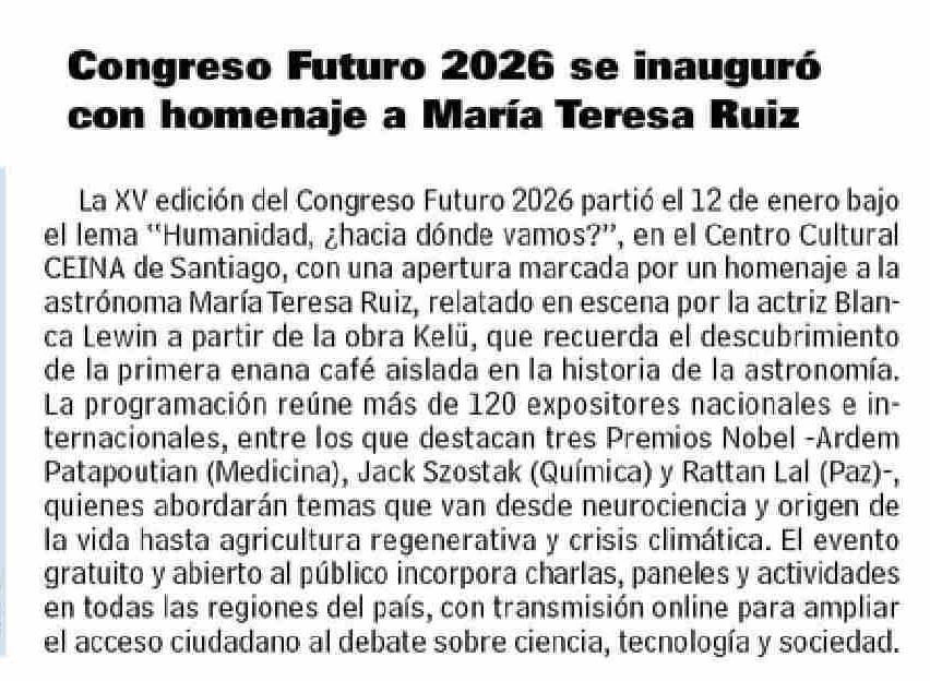 Congreso Futuro 2026 se inauguró con homenaje a María Teresa Ruiz 13-01-2026 Las Últimas Noticias |