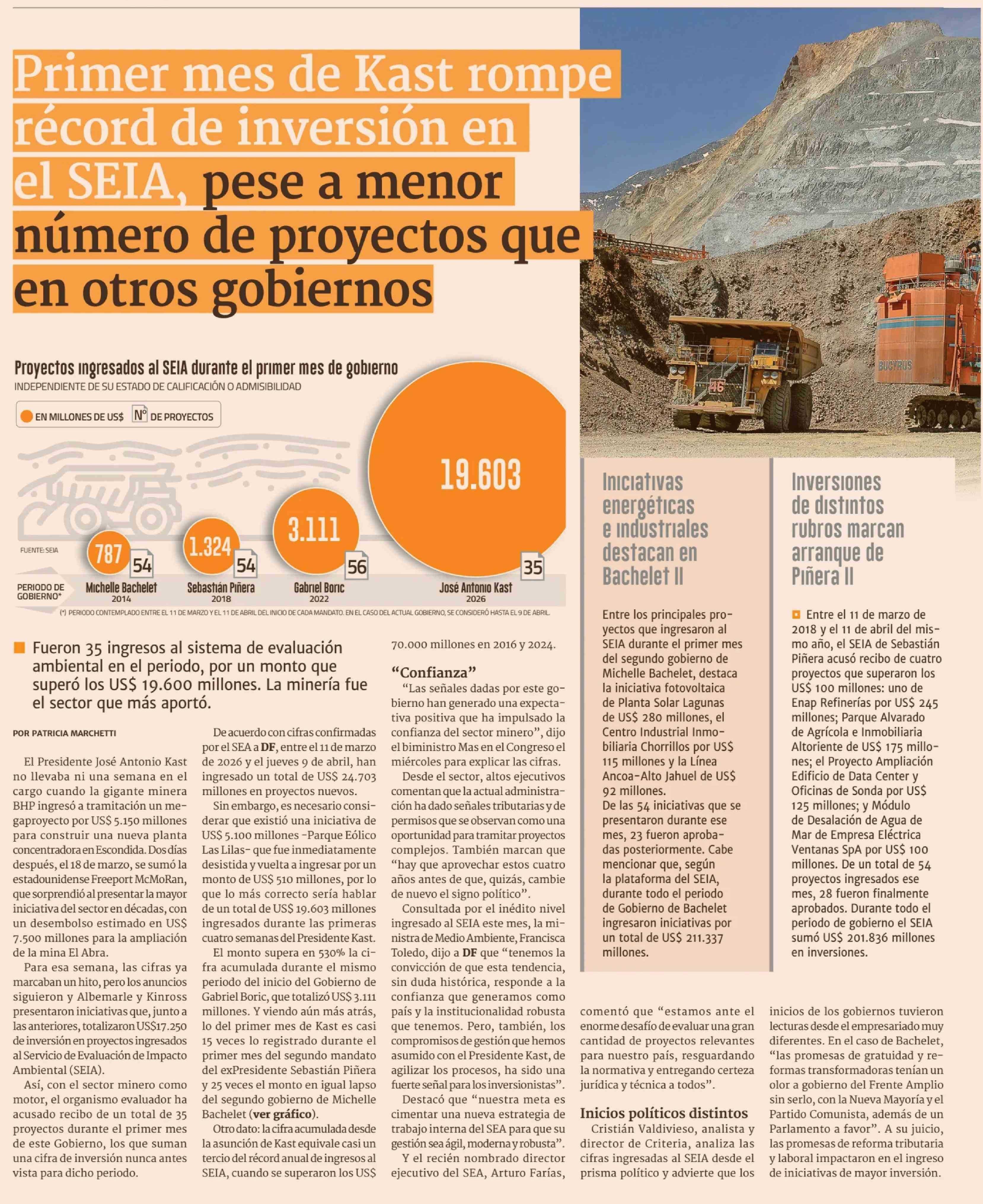 Primer mes de Kast rompe récord de inversión en el SEIA, pese a menor número de proyectos que en otros gobiernos 10-04-2026 Diario Financiero |