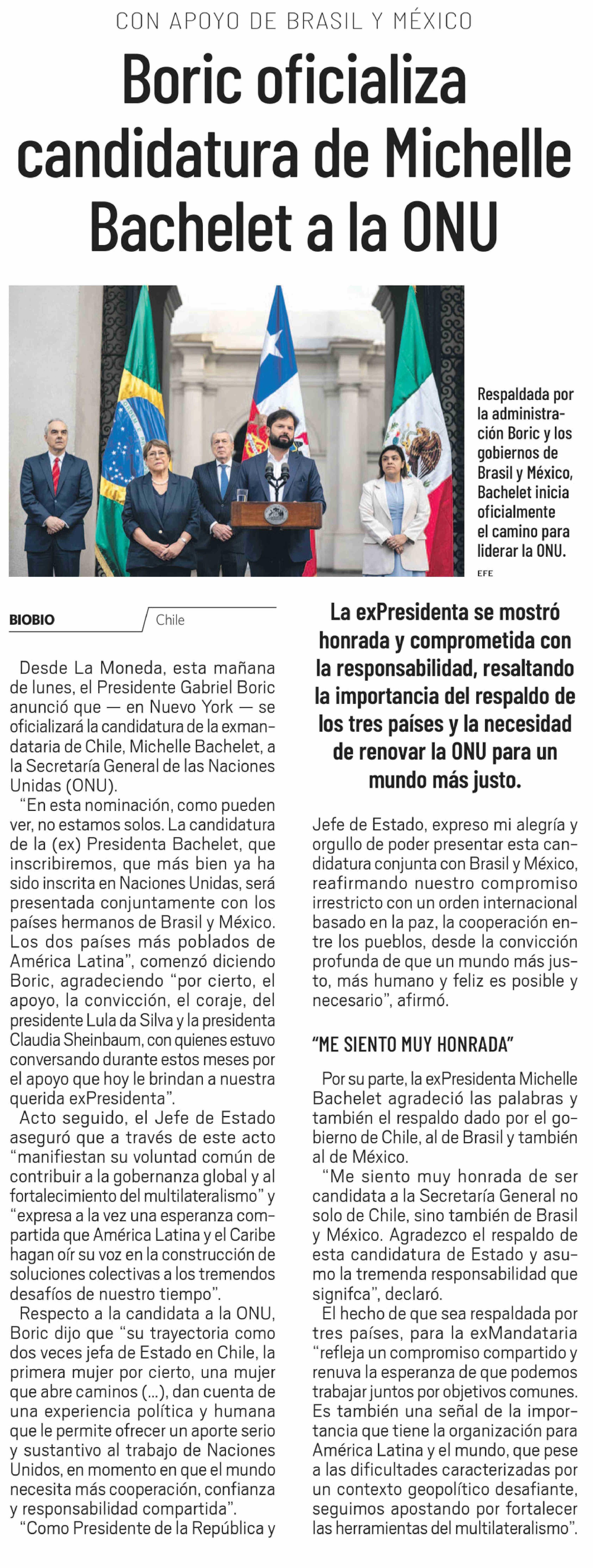 | Título: | Boric oficializa candidatura de Michelle Bachelet a la ONU |