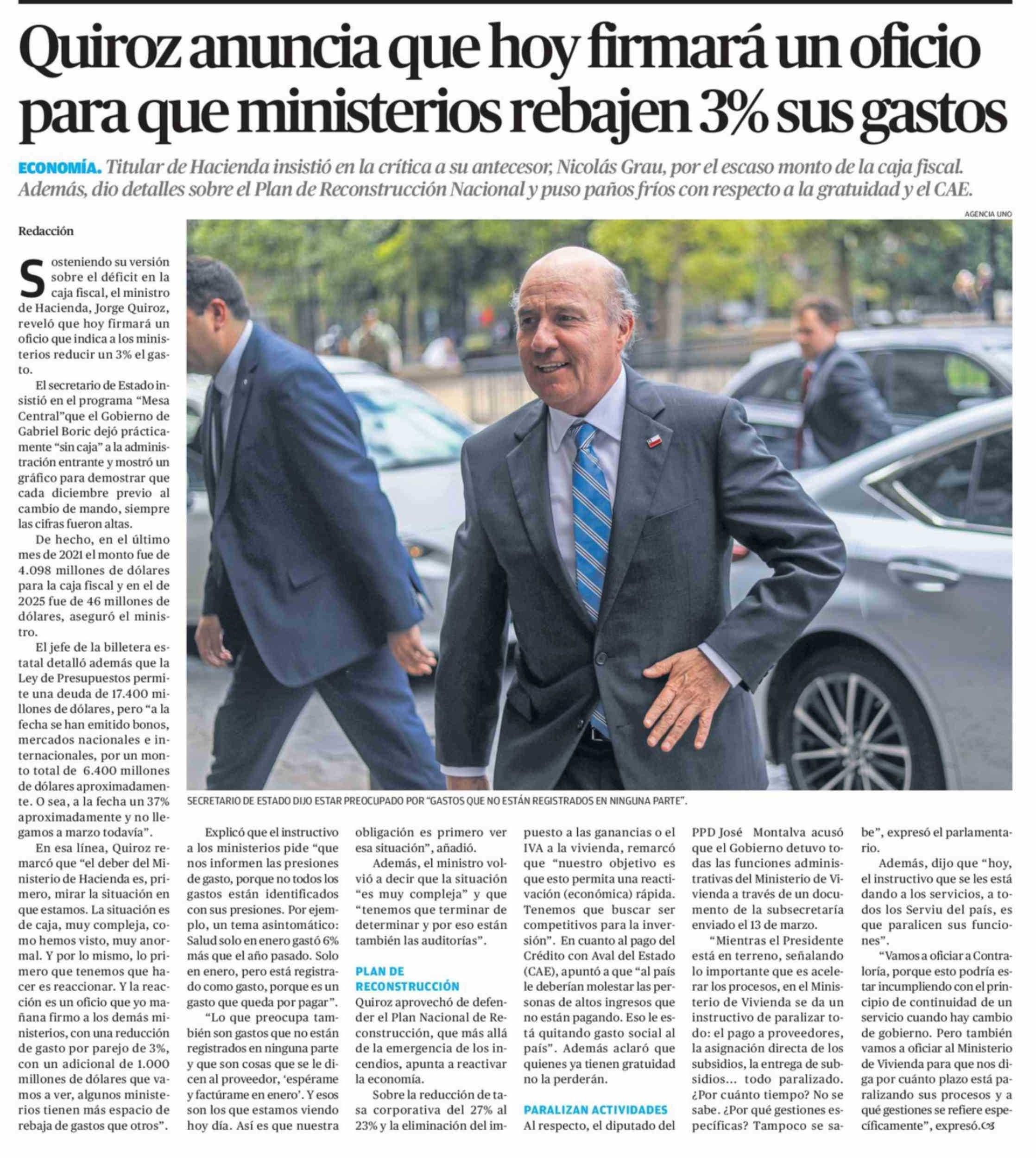 Título: Quiroz anuncia que hoy firmará un oficio para que ministerios rebajen 3% sus gastos