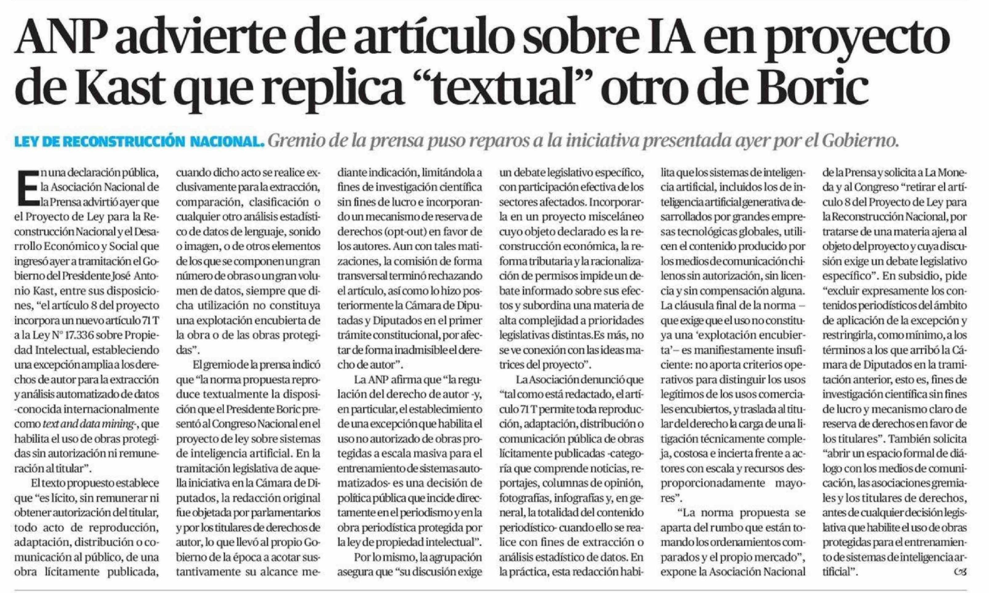 ANP advierte de artículo sobre IA en proyecto de Kast que replica "textual" otro de Boric 23-04-2026 El Mercurio de Calama |