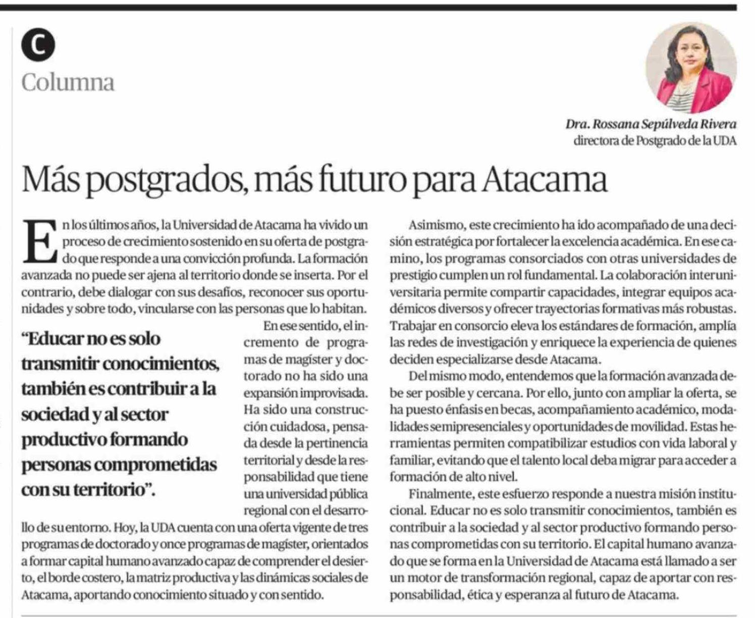 Columnas de Opinión: Más postgrados, más futuro para Atacama 14-02-2026 El Diario de Atacama |