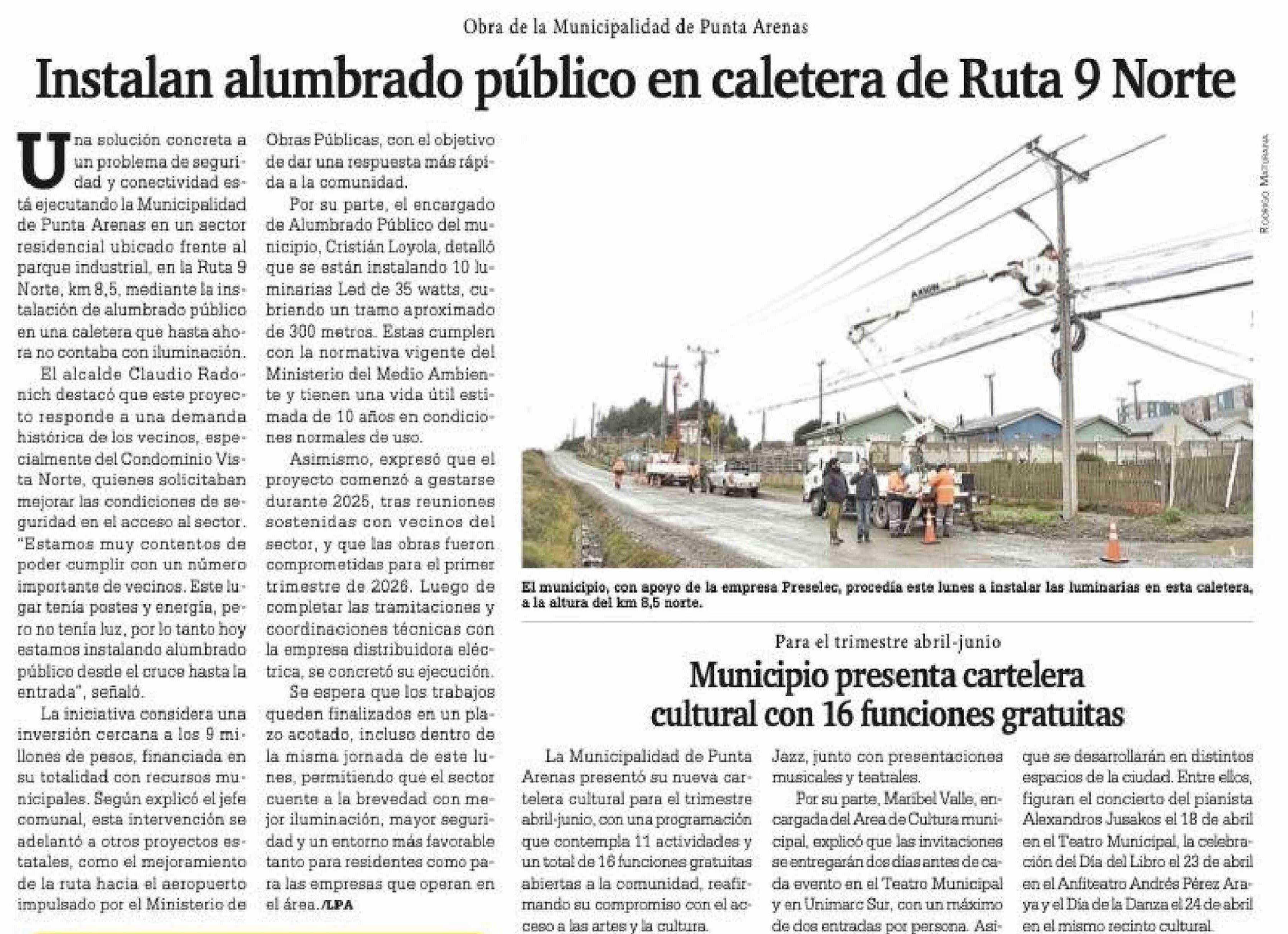 Instalan alumbrado público en caletera de Ruta 9 Norte 14-04-2026 La Prensa Austral |